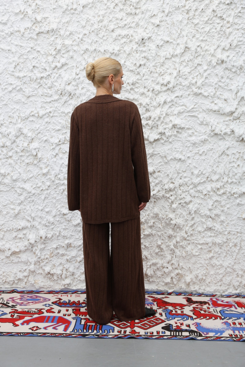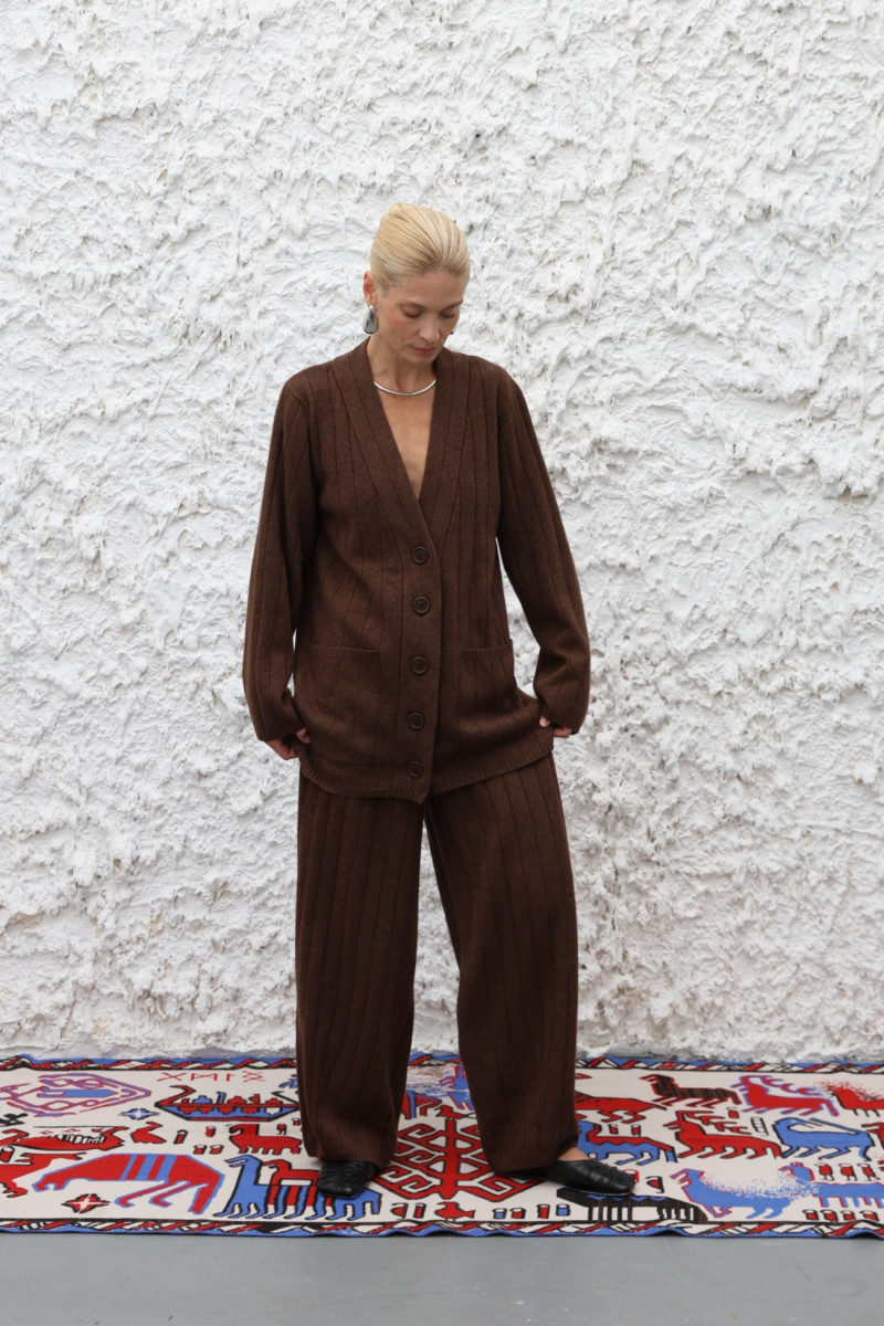 Трикотажні штани повної довжини з вовняної пряжі, гладкого переплетіння у вигляді об’ємних вертикальних смуг, що змінюють напрямок у місцях звуження. Висока посадка, еластичний пояс, вільні від стегна та об’ємно завужені донизу.