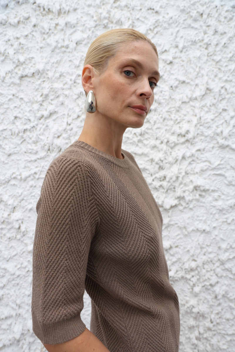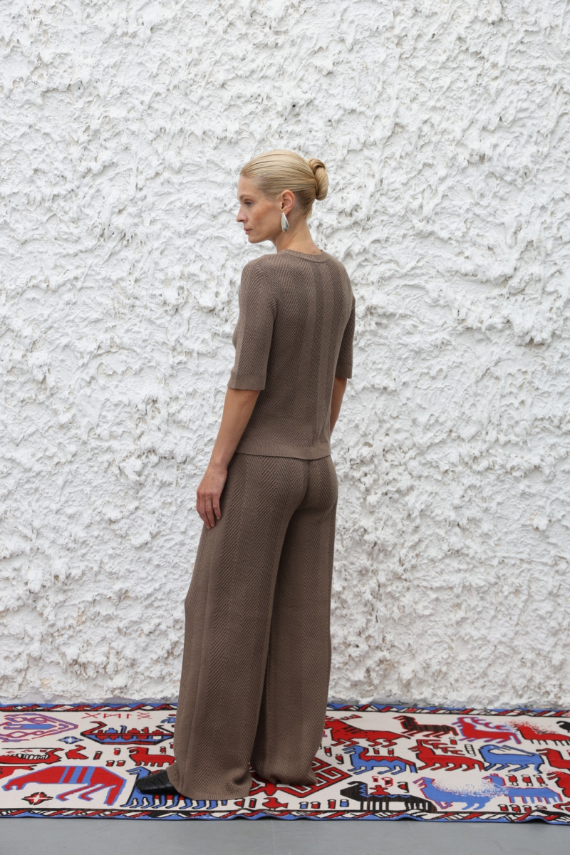 Трикотажний джемпер із вовняної пряжі щільного переплетіння «ялинка», що формує вертикальний візерунок. Прямий силует середньої довжини, кругла горловина, довгі вшивні рукави. Комір, манжети та низ виконані у переплетінні «резинка».