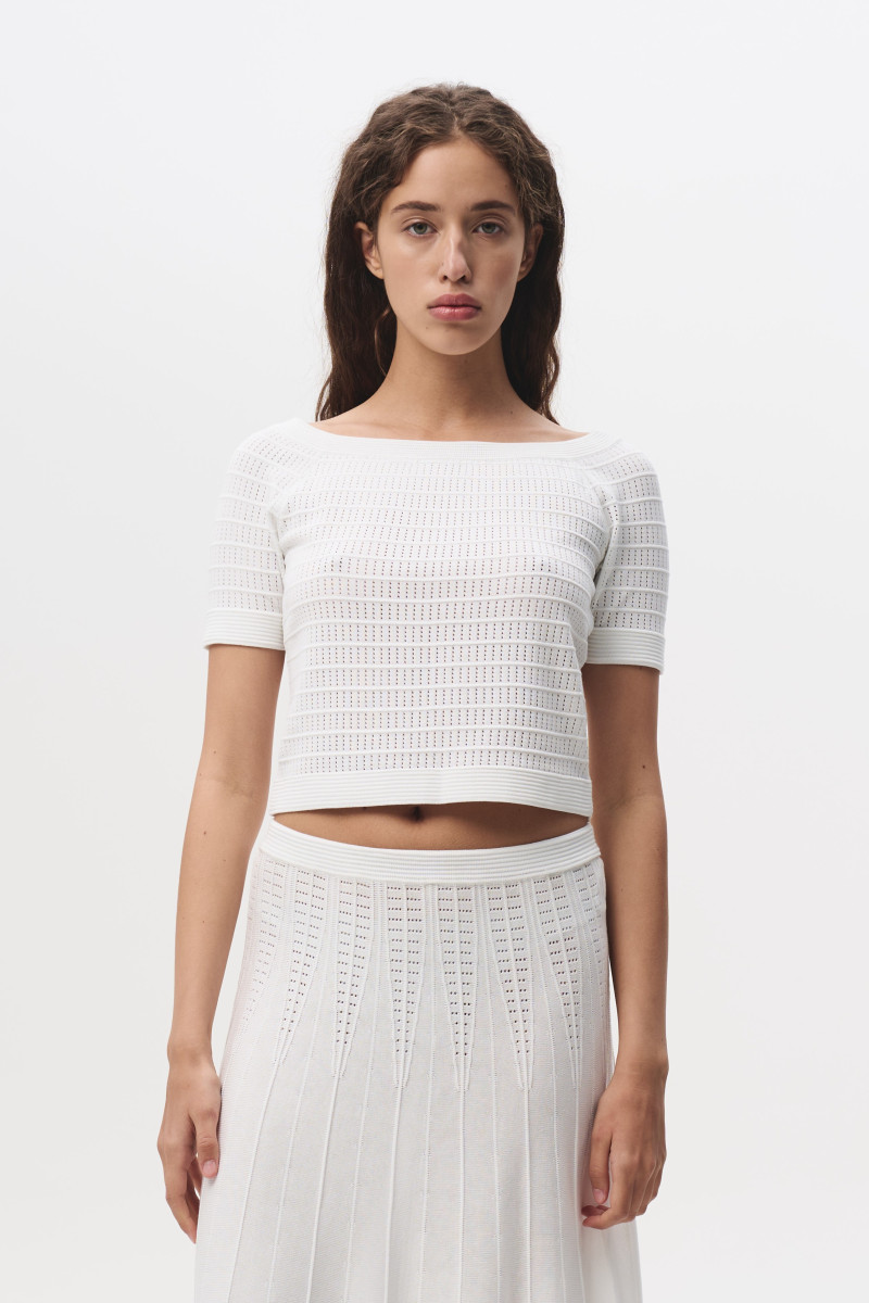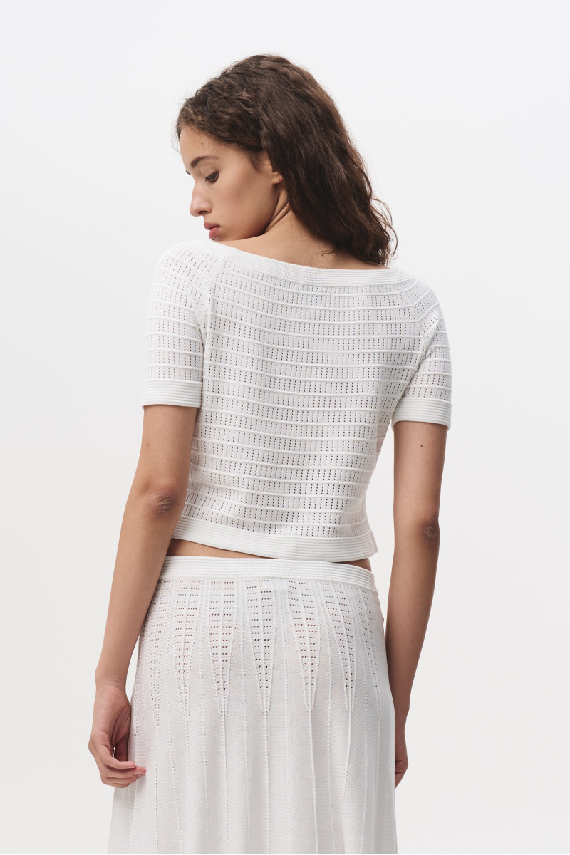 Укорочений джемпер з віскозної пряжі з короткими рукавами-реглан та горловиною-човник. Переплетення створює тонкі об’ємні горизонтальні смуги, які перетинаюся з вертикальними мереживними лініями. Горловина, манжети та низ оздоблені планками в тонку об’ємну смужку.