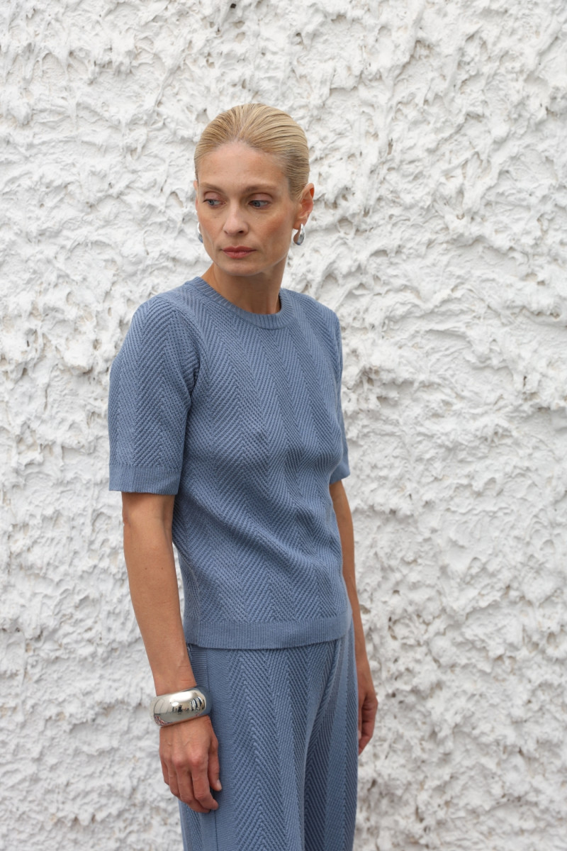 Трикотажний джемпер із вовняної пряжі щільного переплетіння «ялинка», що формує вертикальний візерунок. Прямий силует середньої довжини, кругла горловина, довгі вшивні рукави. Комір, манжети та низ виконані у переплетінні «резинка».
