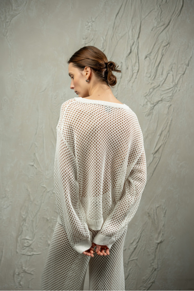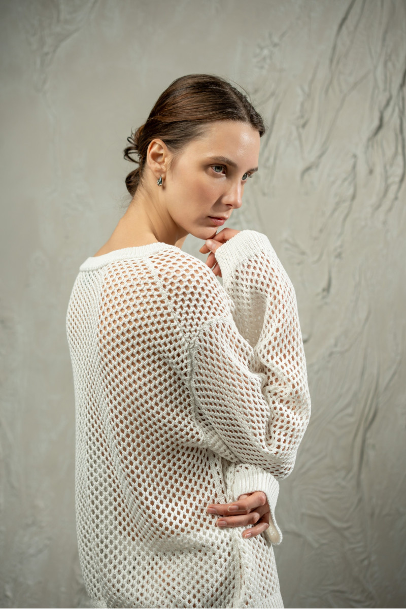 Oversize-джемпер з мереживним переплетінням типу дрібна сітка, виконаний із віскозної пряжі. Модель прямого силуету, довжиною до середини стегна, з круглою горловиною.