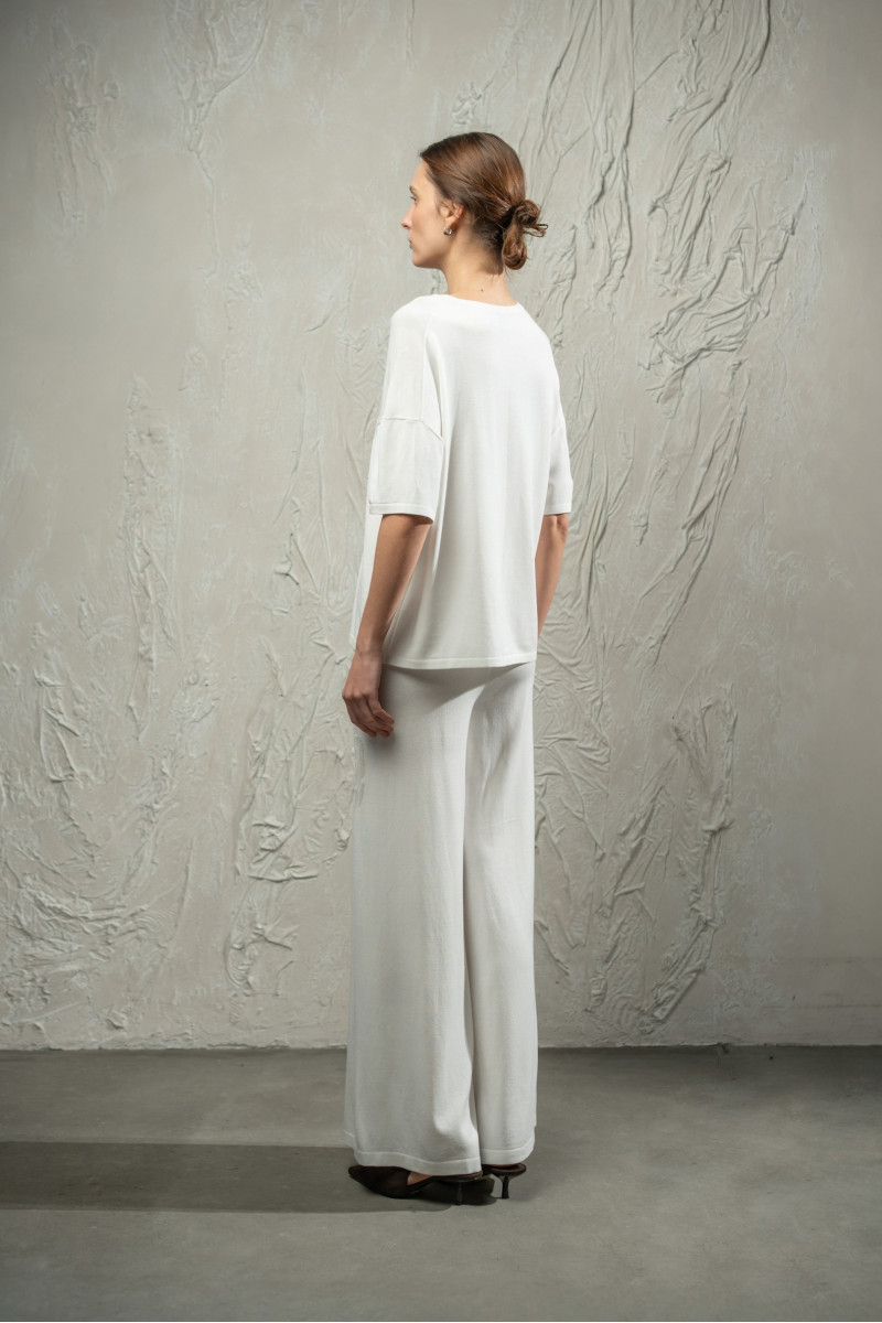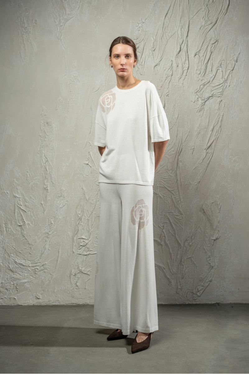 Трикотажні брюки з напівпрозорим візерунком троянди на штанинах. Модель із високою посадкою та еласт..