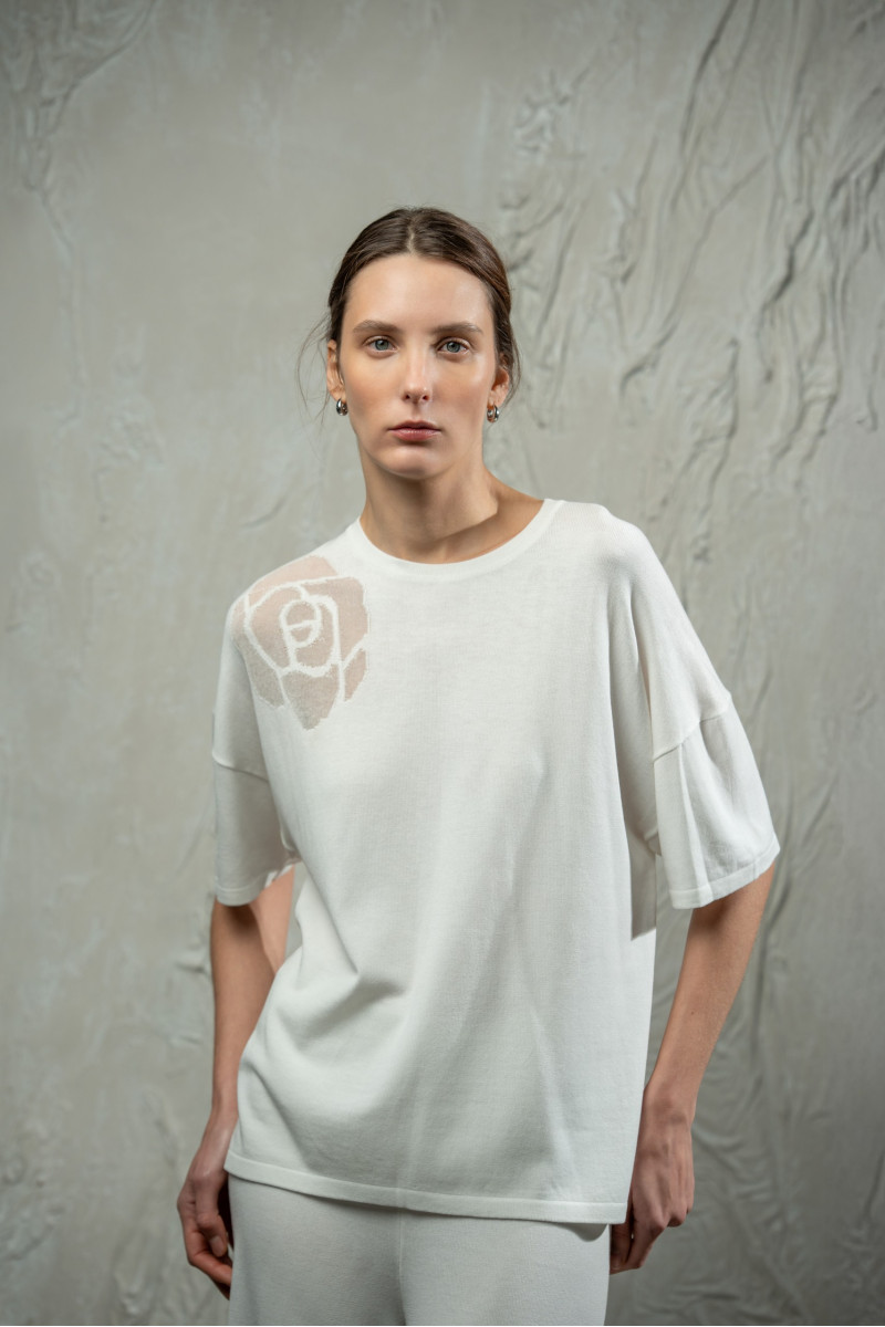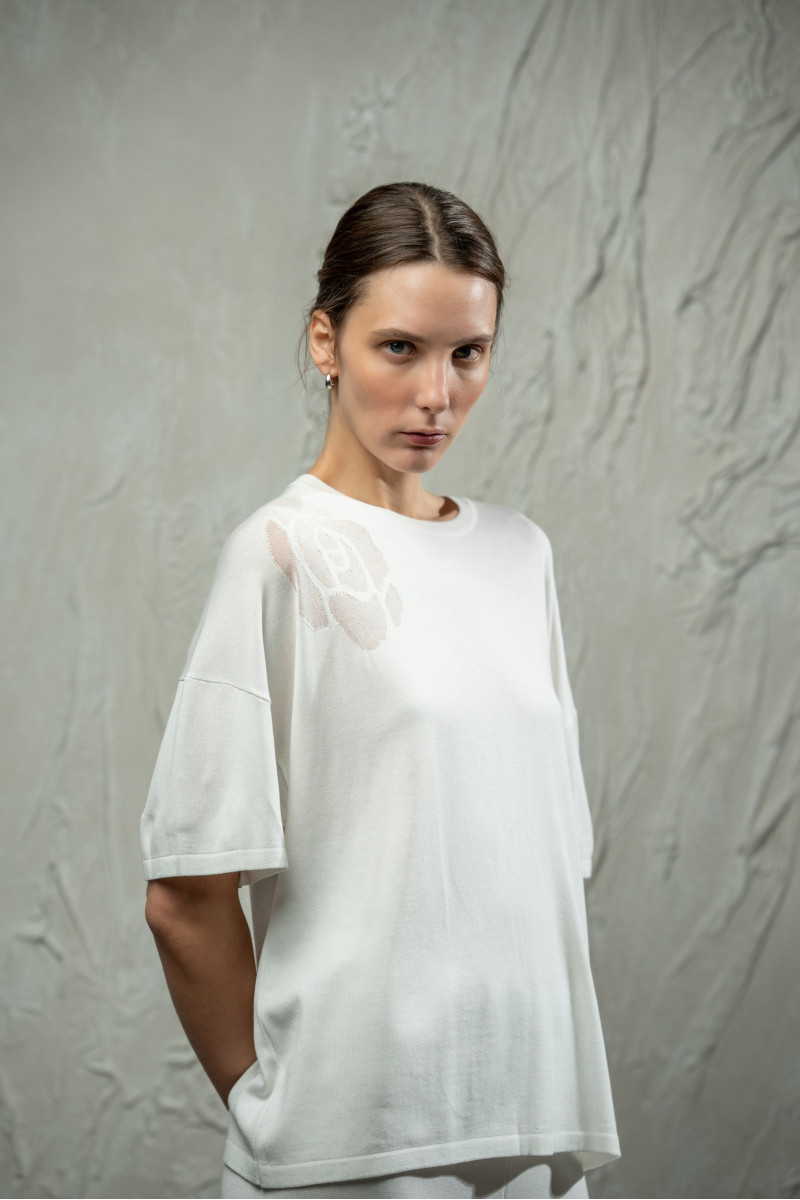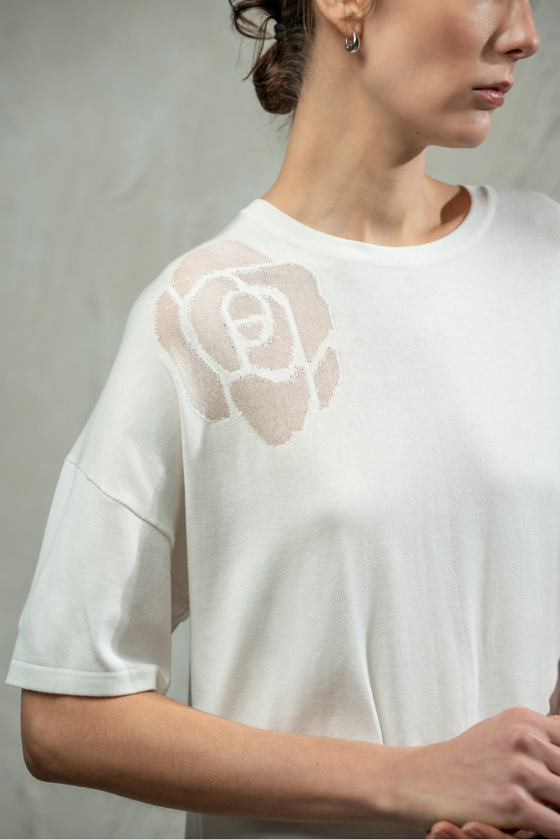 Трикотажна oversize-сорочка з напівпрозорим візерунком троянди на плечі. Модель прямого вільного сил..