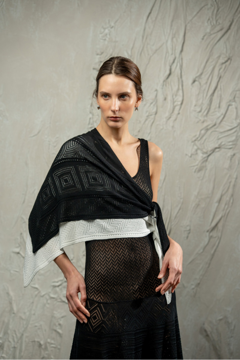 Трикотажна мереживна трикутна хустка з віскозної пряжі. Модель виконана у складному переплетінні з геометричними мотивами, що формують виразну ажурну фактуру та ритмічний візерунок по всій поверхні. Легка й пластична, м’яко драпірується та делікатно доповнює образ. Краї оформлені торочками, що підсилюють динаміку руху. Може носитися на шиї, плечах або як аксесуар для голови.