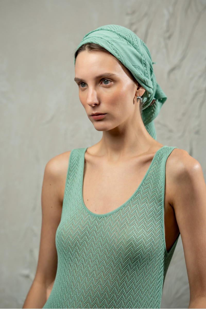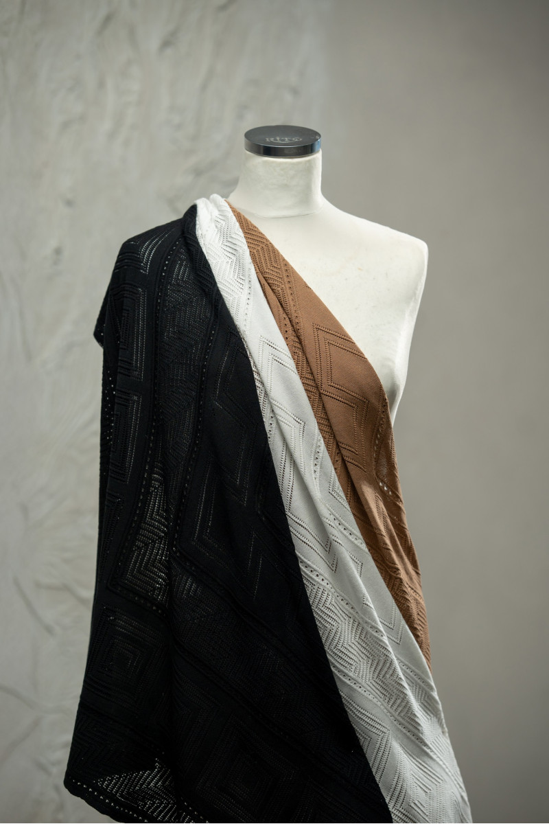 Трикотажна мереживна трикутна хустка з віскозної пряжі. Модель виконана у складному переплетінні з геометричними мотивами, що формують виразну ажурну фактуру та ритмічний візерунок по всій поверхні. Легка й пластична, м’яко драпірується та делікатно доповнює образ. Краї оформлені торочками, що підсилюють динаміку руху. Може носитися на шиї, плечах або як аксесуар для голови.