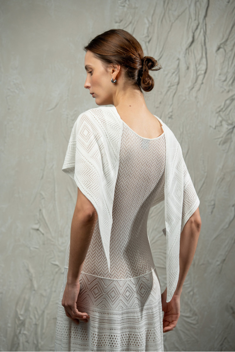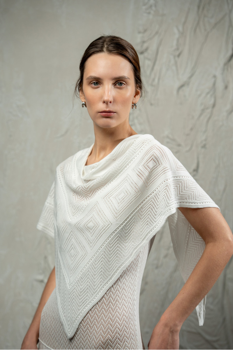 Трикотажна мереживна трикутна хустка з віскозної пряжі. Модель виконана у складному переплетінні з геометричними мотивами, що формують виразну ажурну фактуру та ритмічний візерунок по всій поверхні. Легка й пластична, м’яко драпірується та делікатно доповнює образ. Краї оформлені торочками, що підсилюють динаміку руху. Може носитися на шиї, плечах або як аксесуар для голови.