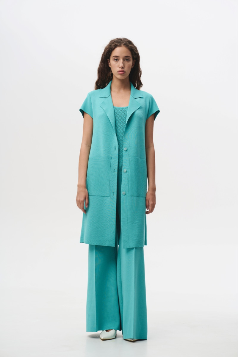 застібається на ґудзики, довжиною до колін, виготовлений із тонкої віскозної