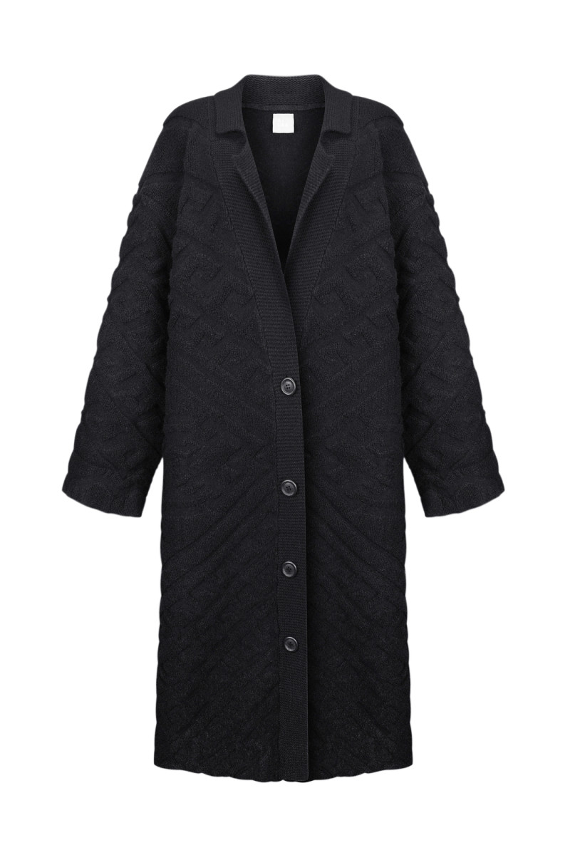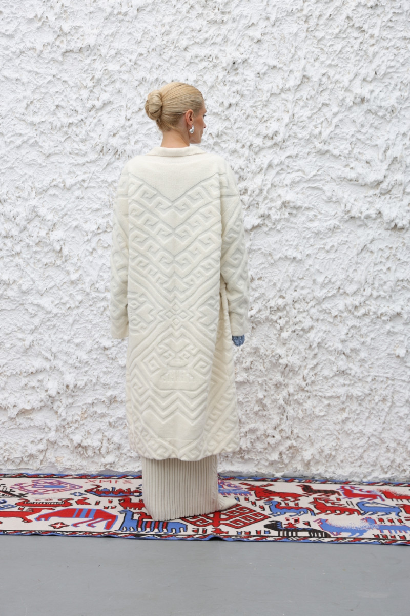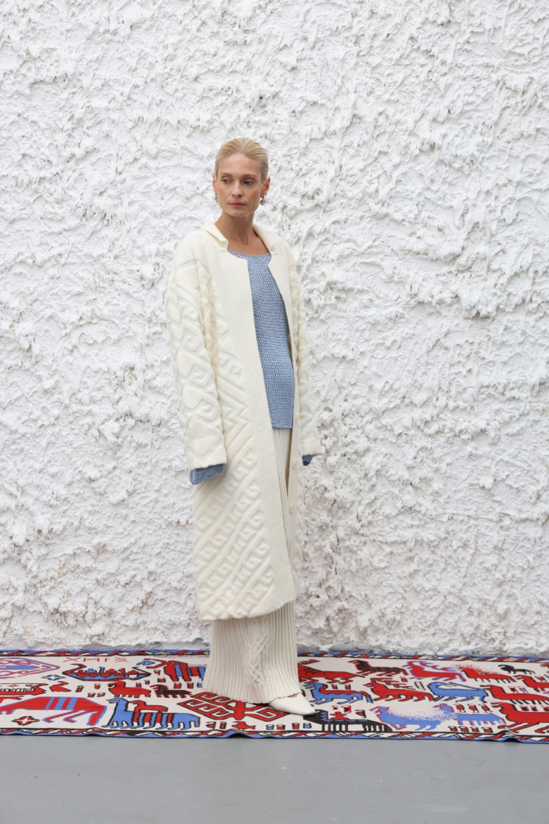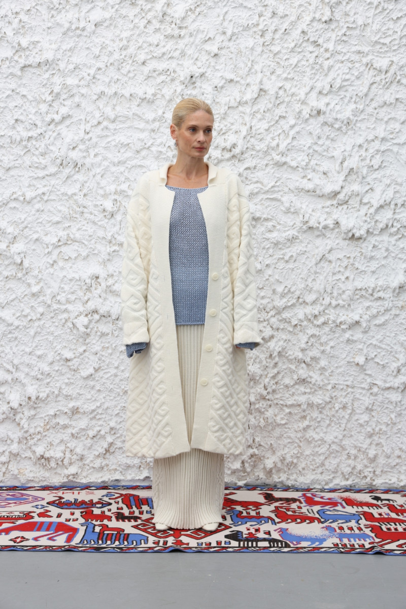 Трикотажне пальто прямого силуету з переплетенням, що імітує вистрижене аранами руно. Довжина — до середини гомілки. Відкладний комір із лацканами, застібка на кнопки. Виконано з об’ємної вовняної пряжі без підкладки.