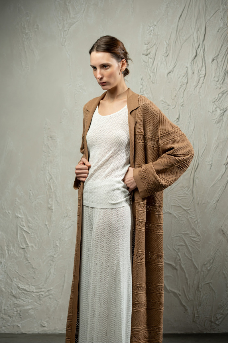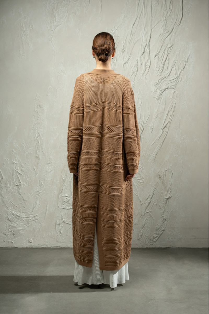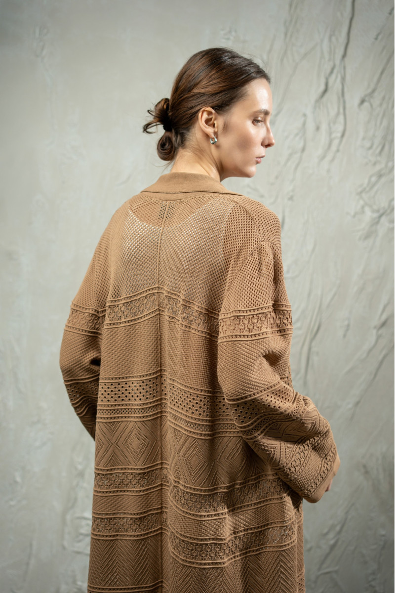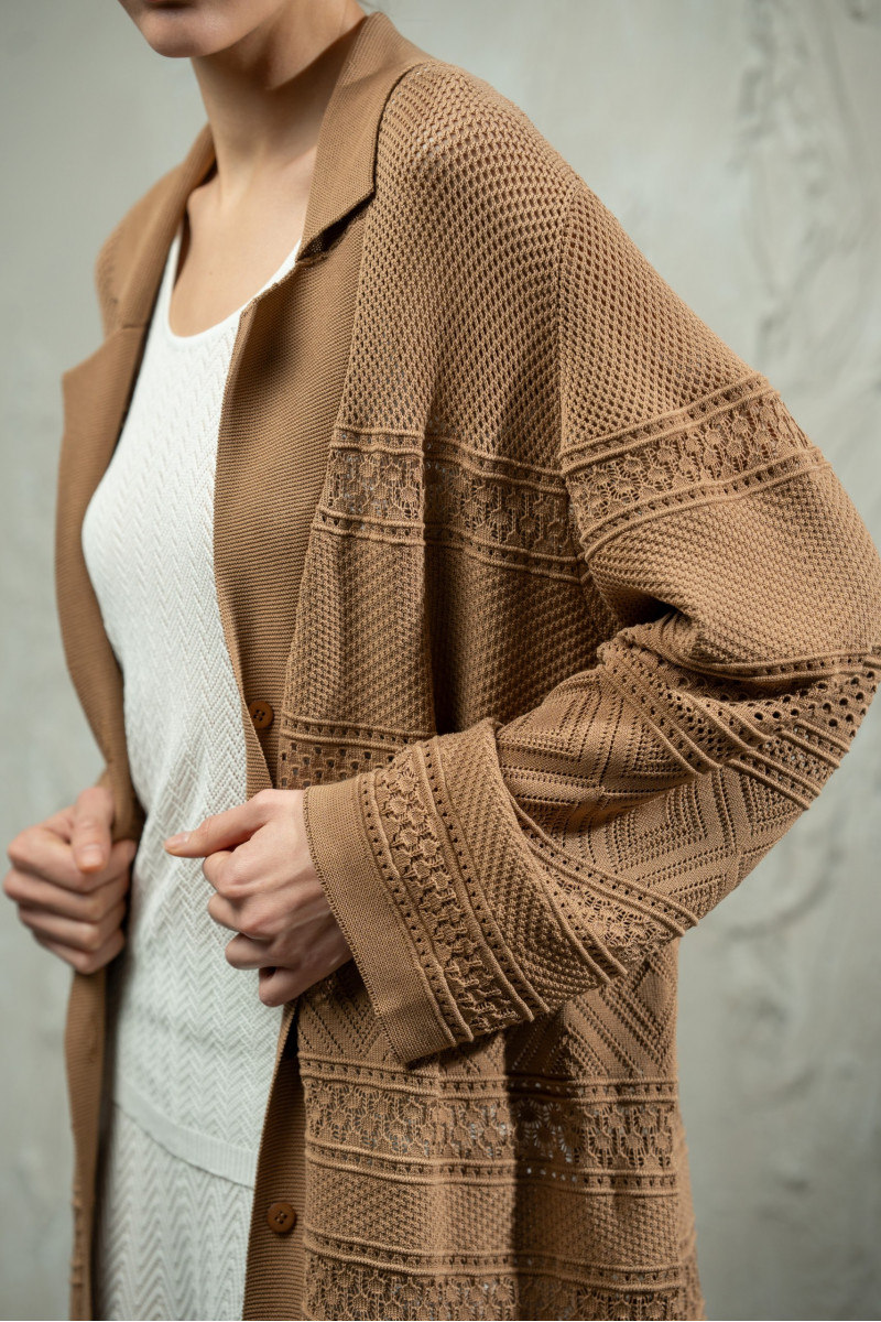 Виконаний з віскозної пряжі у складному переплетінні, що поєднує горизонтальні блоки геометричних орнаментів. Виразна мереживна фактура створює ритмічний візерунок по всій довжині виробу та підкреслює легкість кардигану.