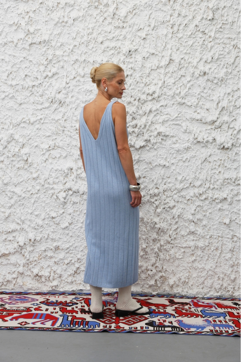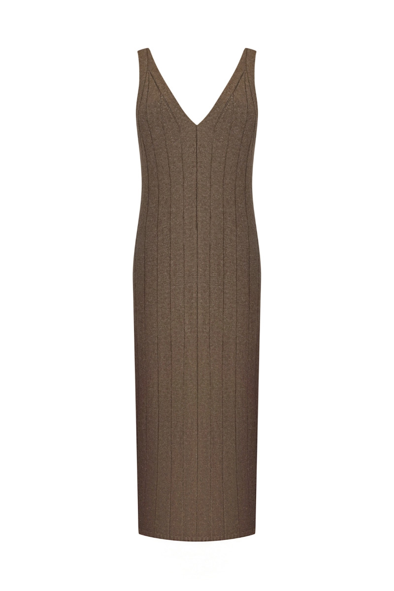 Трикотажна сукня без рукавів на бретелях середньої ширини з глибокими V-подібними вирізами спереду та ззаду. Прямий напівоблягаючий силует, довжина 7/8. Виготовлена з вовняної пряжі, гладке переплетіння у вигляді об’ємних вертикальних смуг.