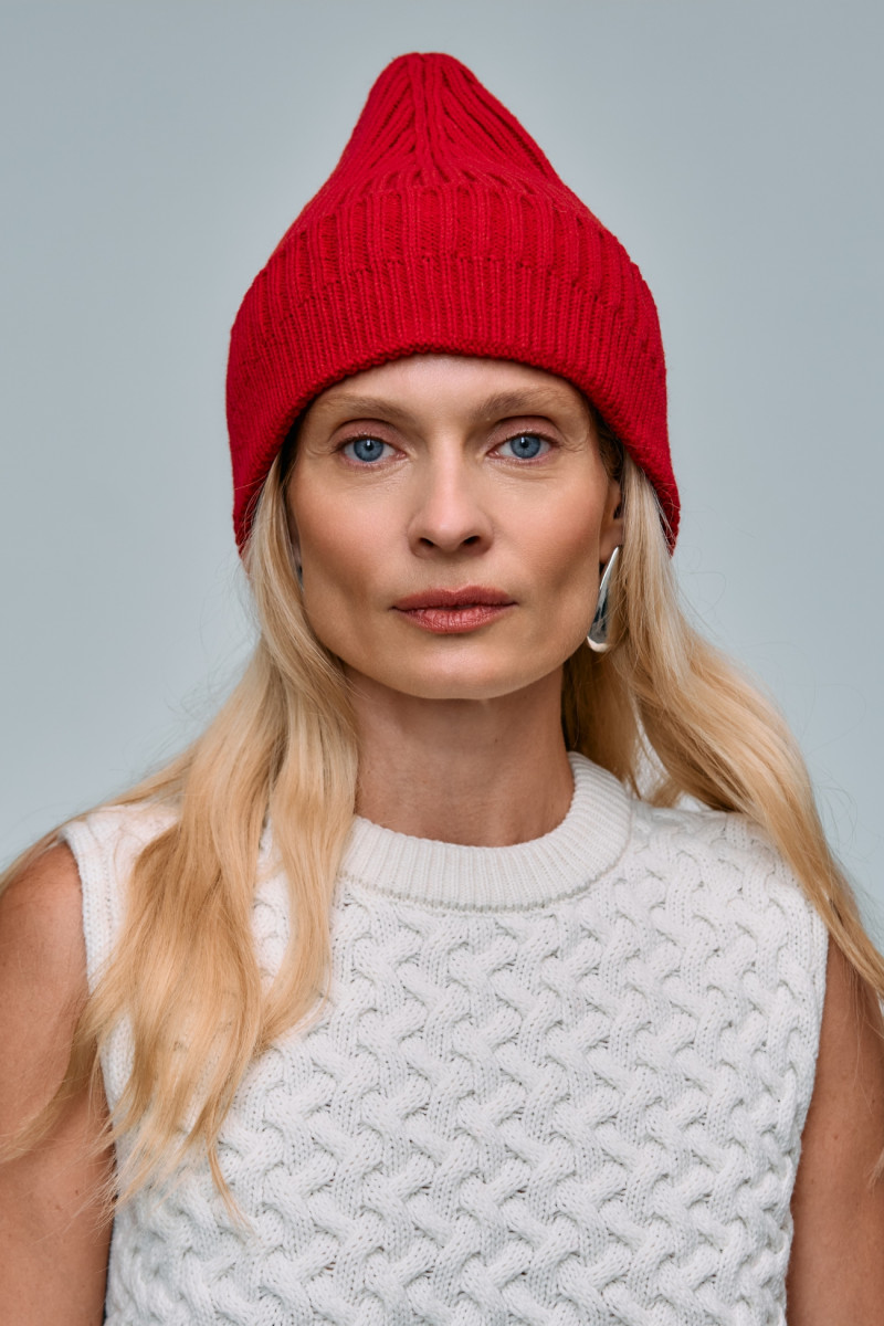 Шапка з вовняної пряжі з переплетенням у вигляді об’ємних вертикальних смуг. Форма натхненна середньовічними шоломами слов’ян та вікінгів.