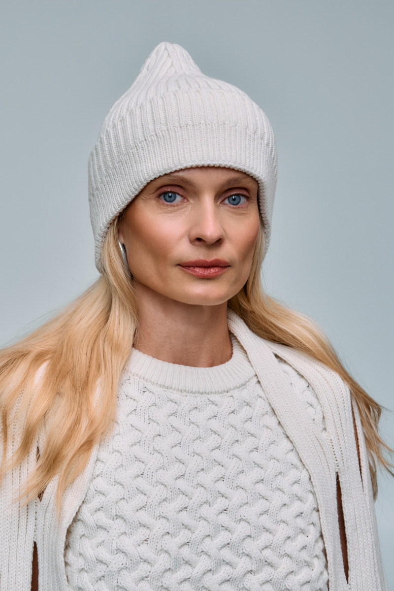 Шапка з вовняної пряжі з переплетенням у вигляді об’ємних вертикальних смуг. Форма натхненна середньовічними шоломами слов’ян та вікінгів.