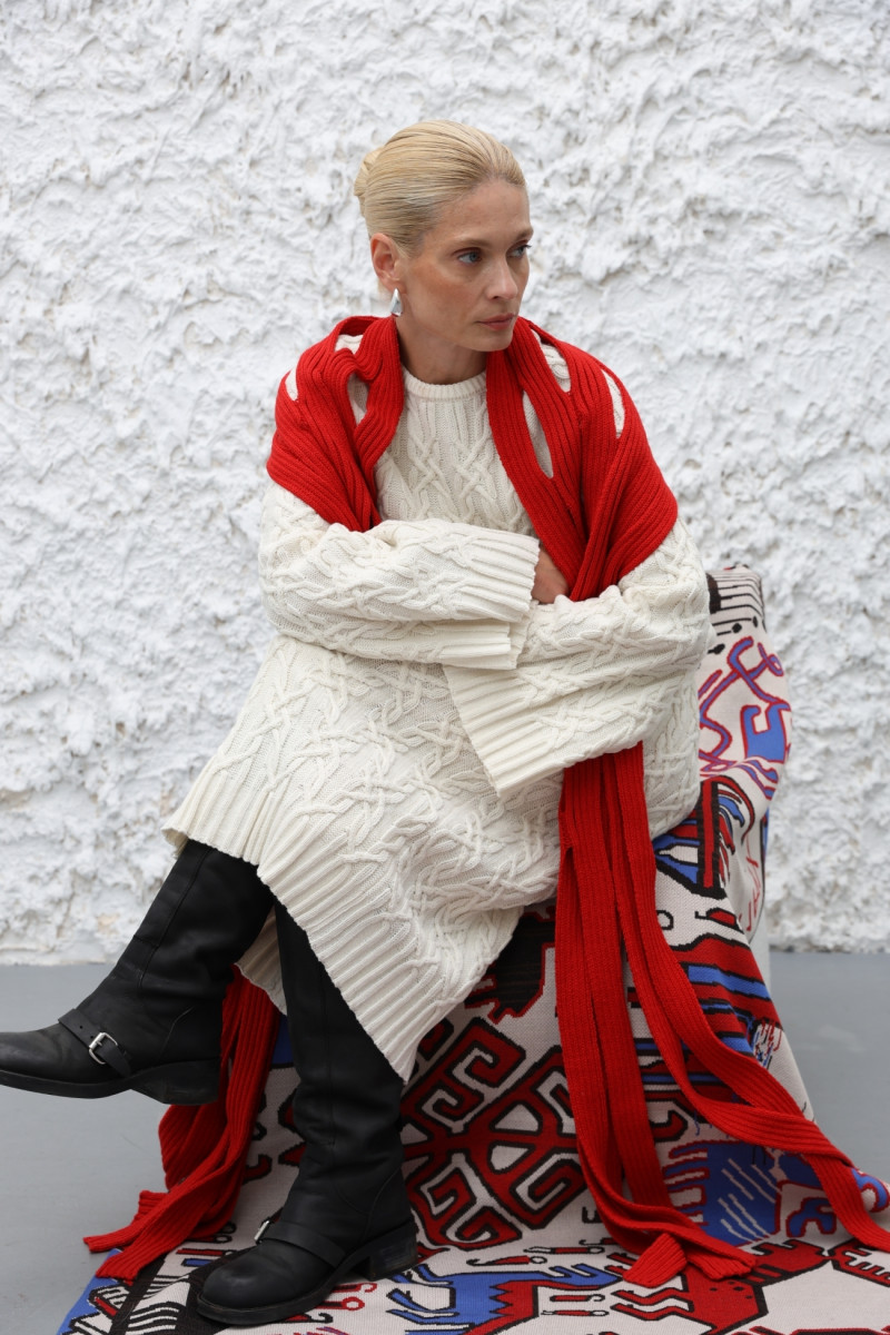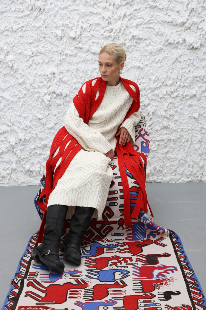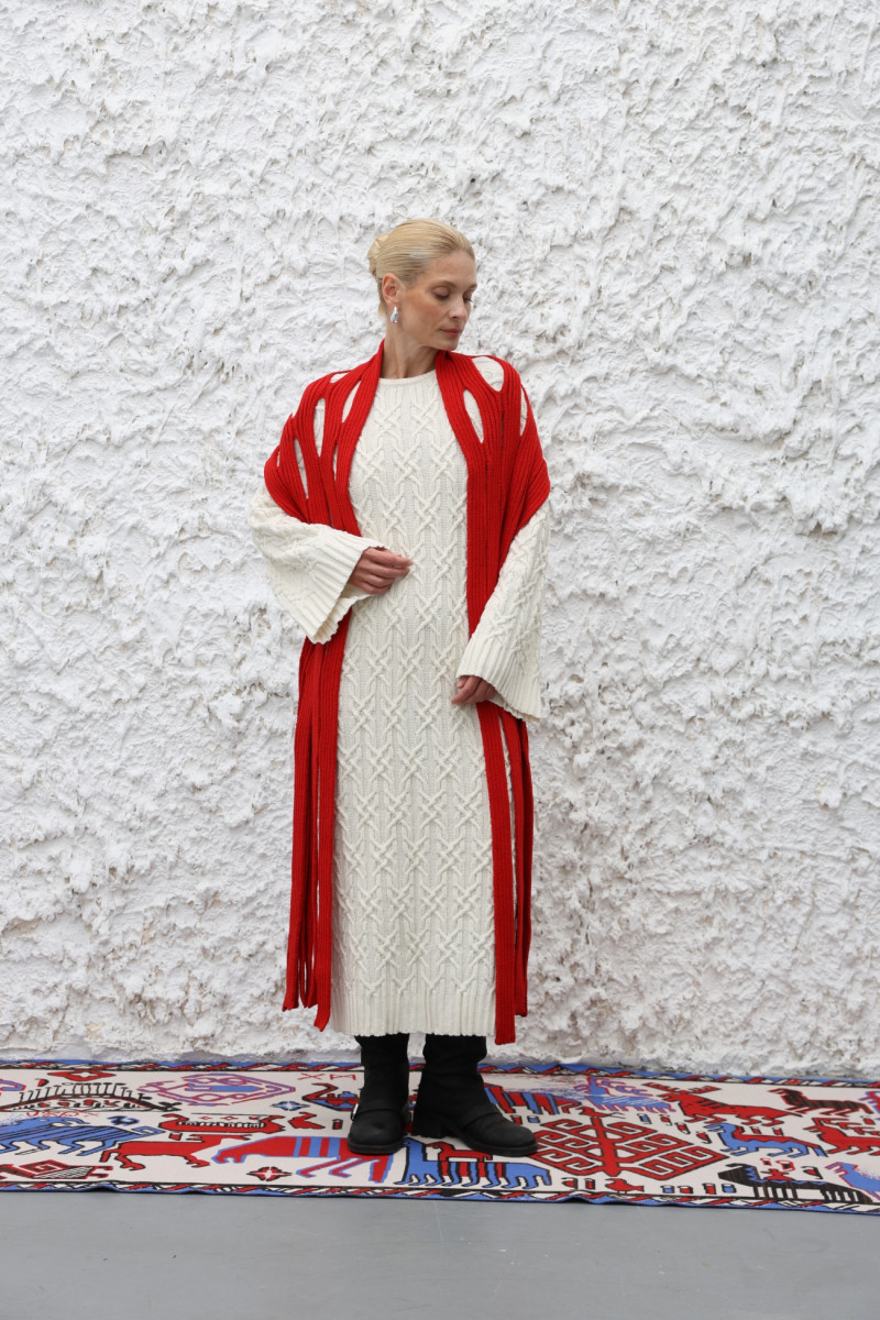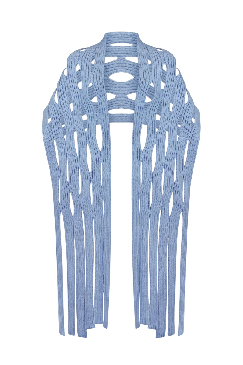 Довга шаль із вовняної пряжі з переплетенням у вигляді об’ємних вертикальних смуг, поєднаних у візерунок ажурних хвиль. Кінці оздоблені довгими декоративними китицями.