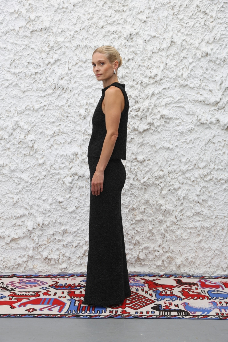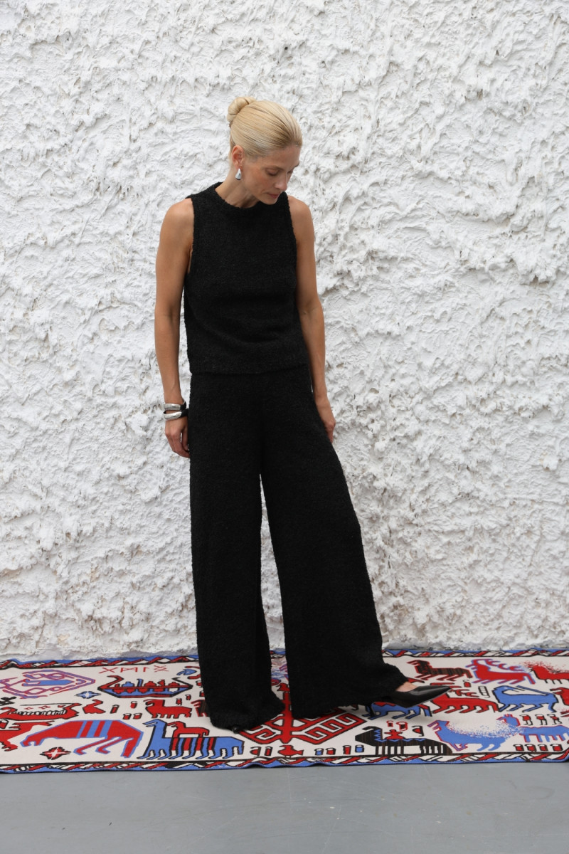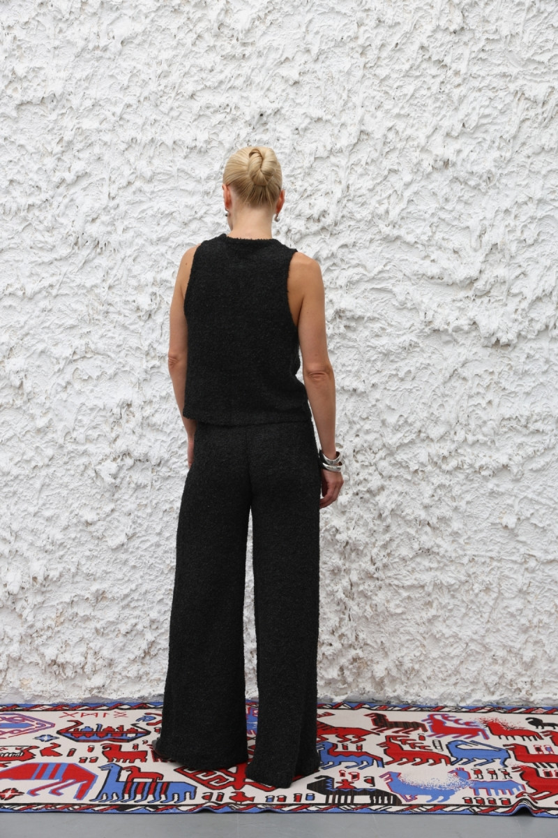 Трикотажні штани з м’якої вовняної пряжі з переплетенням, що імітує руно. Висока посадка на еластичному поясі, вільні від стегна, прямий силует.