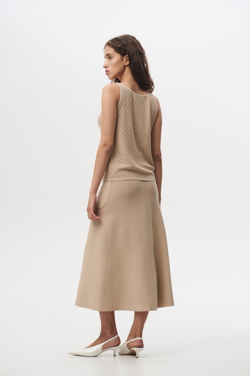 Трикотажна спідниця А-подібного силуету, довжиною до середини гомілки із тонкої віскозної пряжі з гладким щільним переплетенням. Пояс на еластичній гумці. Спідниця оздоблена накладними кишенями зі зрізаними нижніми кутами та декоративним центральним швом, що закінчується високим розрізом по переду спідниці.