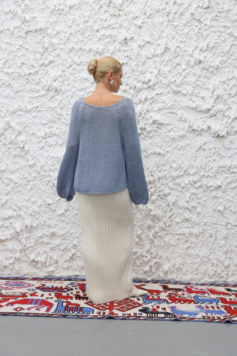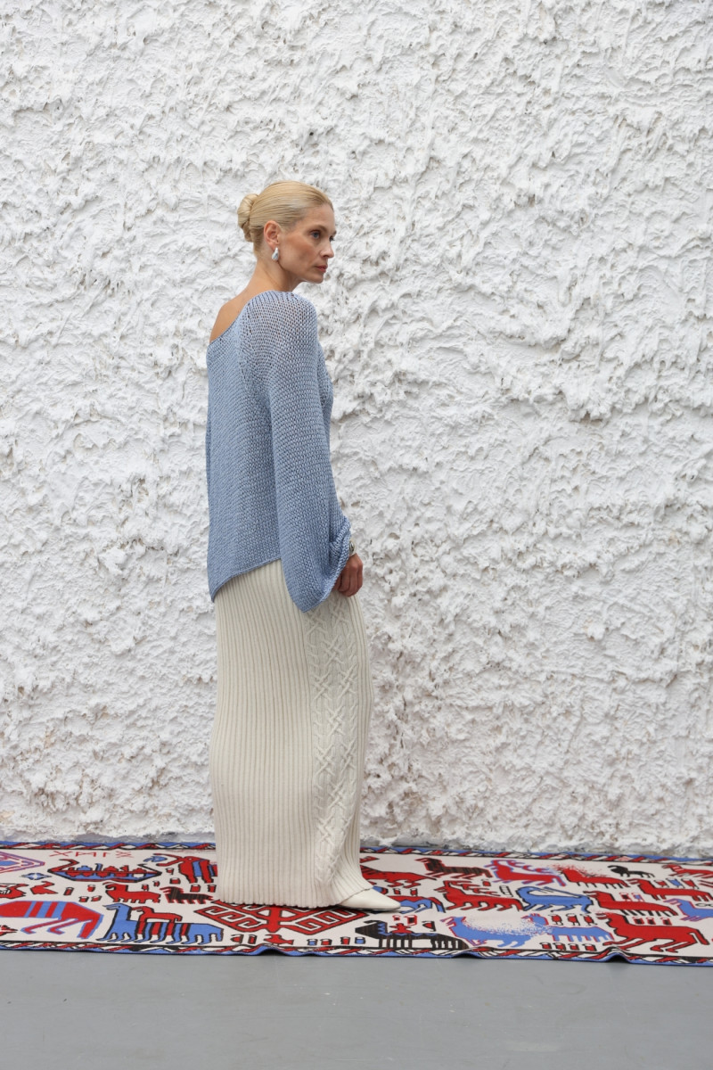 Трикотажна максі-спідниця з вовняної пряжі з візерунком у вигляді дрібних об’ємних вертикальних смуг. Прямий силует, довжина до щиколоток, м’який еластичний пояс.