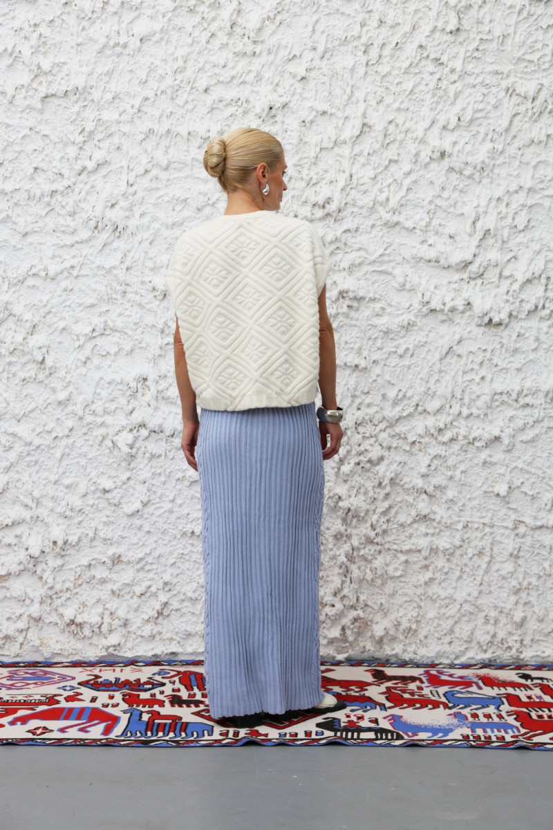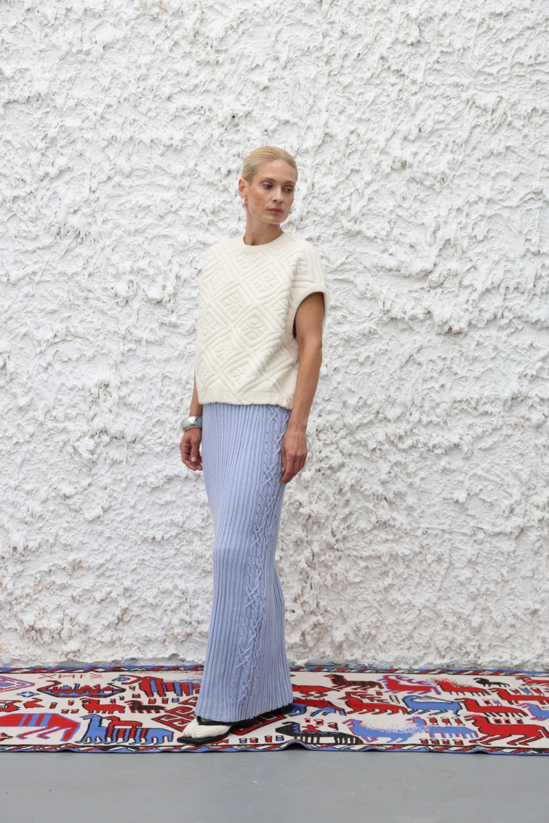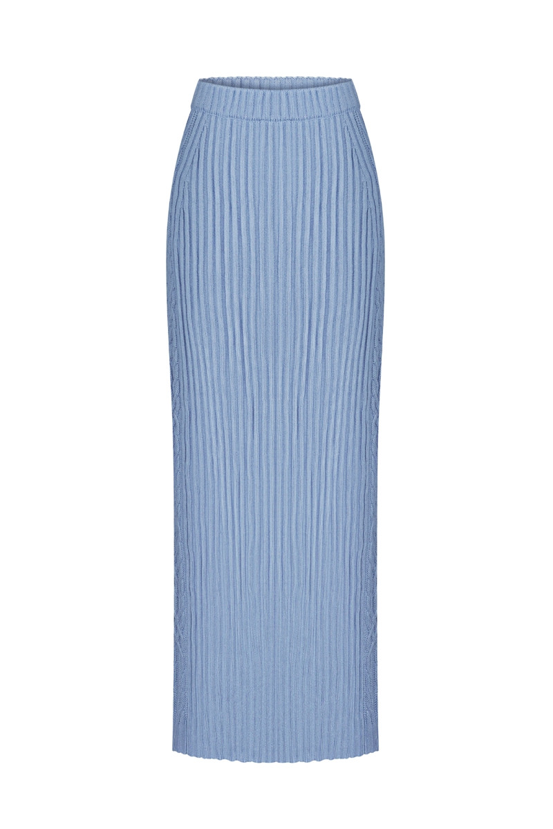 Трикотажна максі-спідниця з вовняної пряжі з візерунком у вигляді дрібних об’ємних вертикальних смуг. Прямий силует, довжина до щиколоток, м’який еластичний пояс.