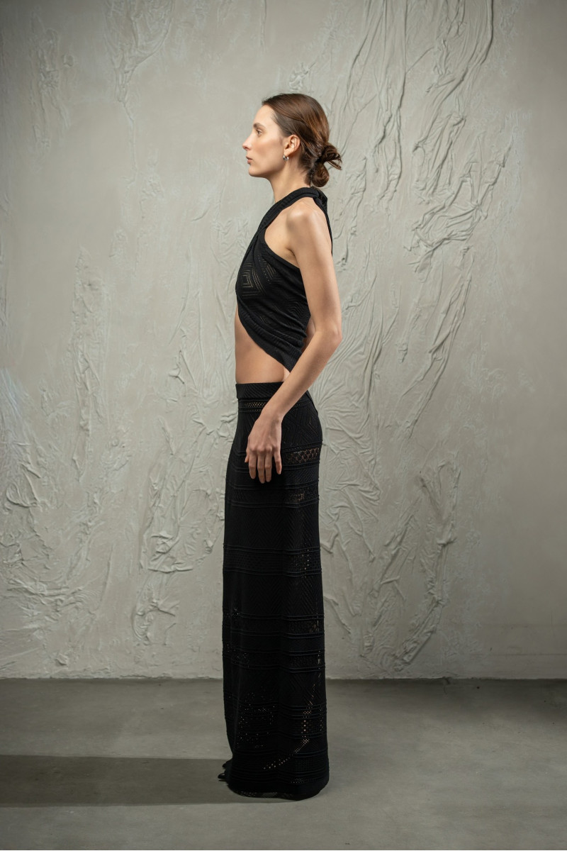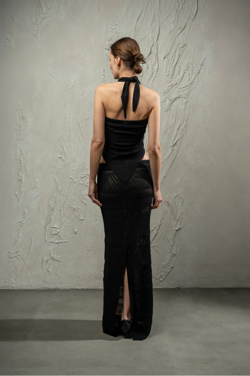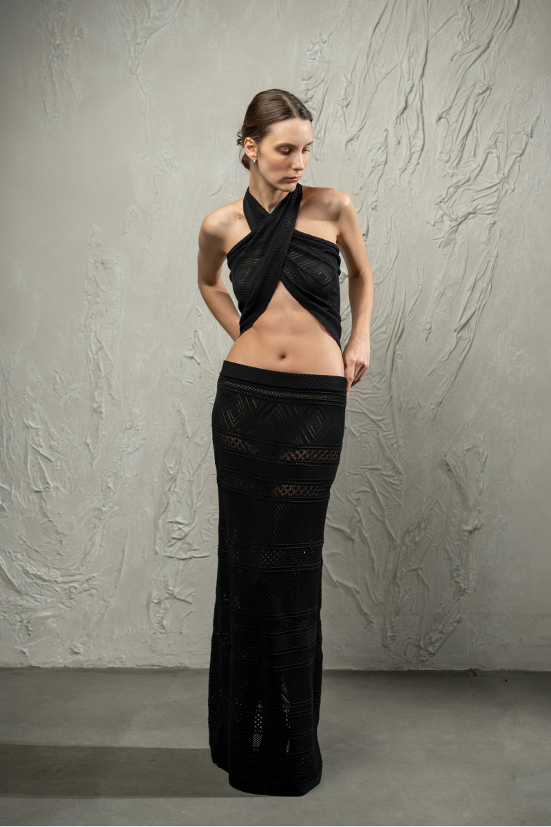 Трикотажна максі-спідниця з віскозної пряжі у складному переплетінні, що поєднує горизонтальні блоки геометричних орнаментів та формує виразну мереживну фактуру з ритмічним візерунком по всій довжині виробу.