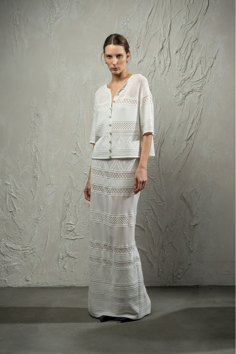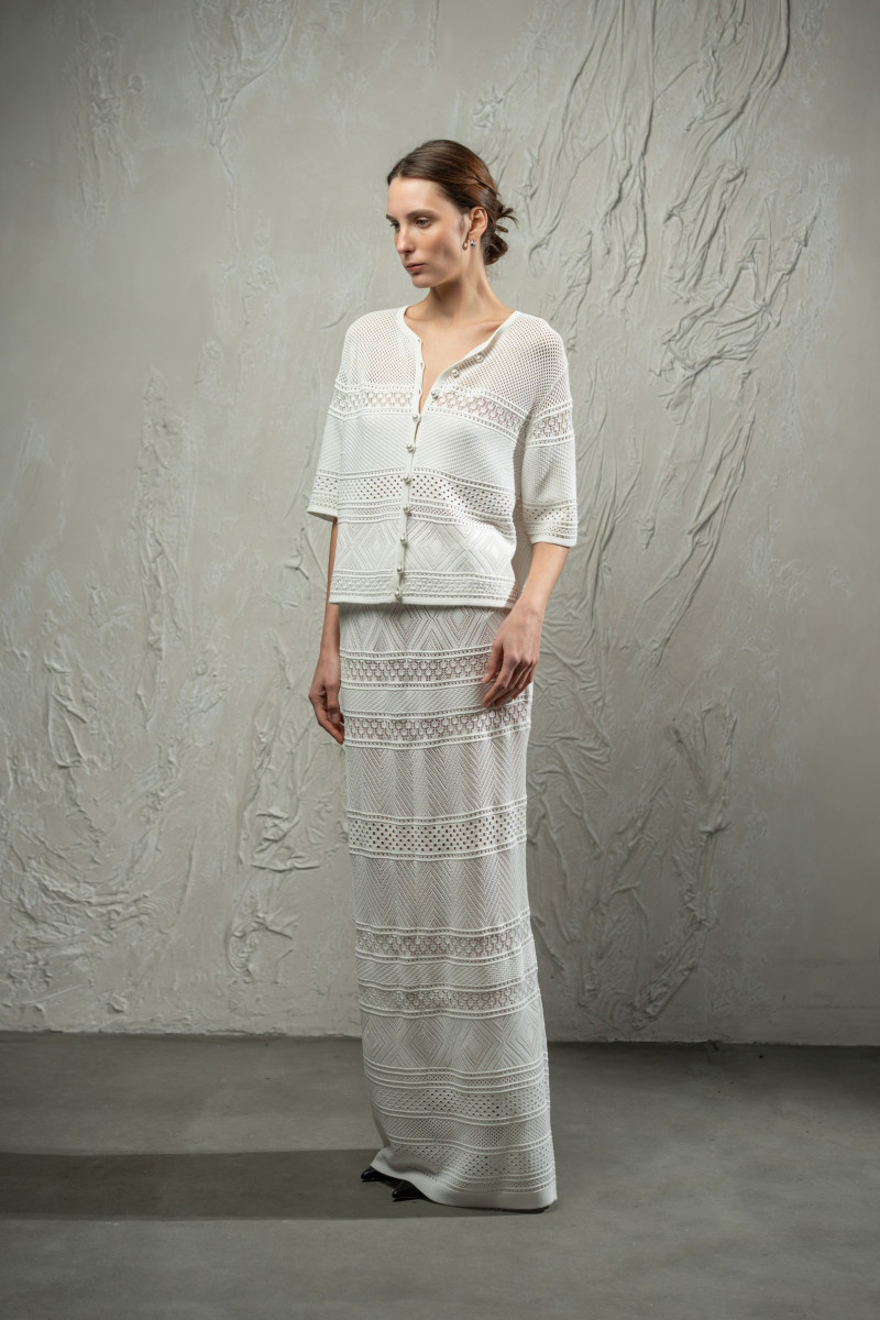 Трикотажна максі-спідниця з віскозної пряжі у складному переплетінні, що поєднує горизонтальні блоки геометричних орнаментів та формує виразну мереживну фактуру з ритмічним візерунком по всій довжині виробу.