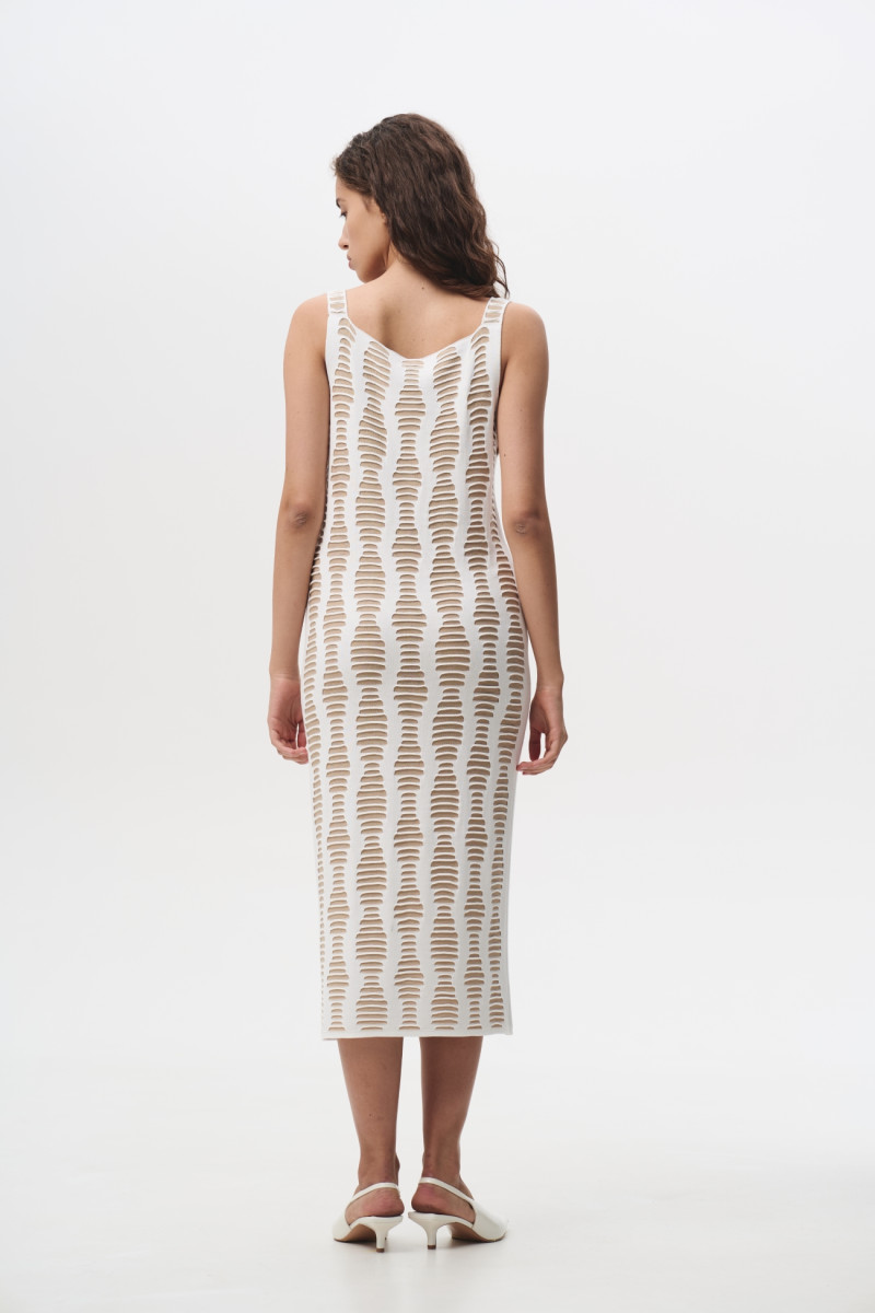 Пряма сукня довжиною до середини гомілки, без рукавів, з глибоким V-подібним декольте, виготовлена із тонкого віскозного двошарового контрастного трикотажу в хвилеподібному переплетенні з імітацією прорізів.
