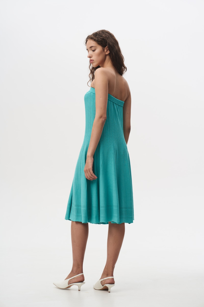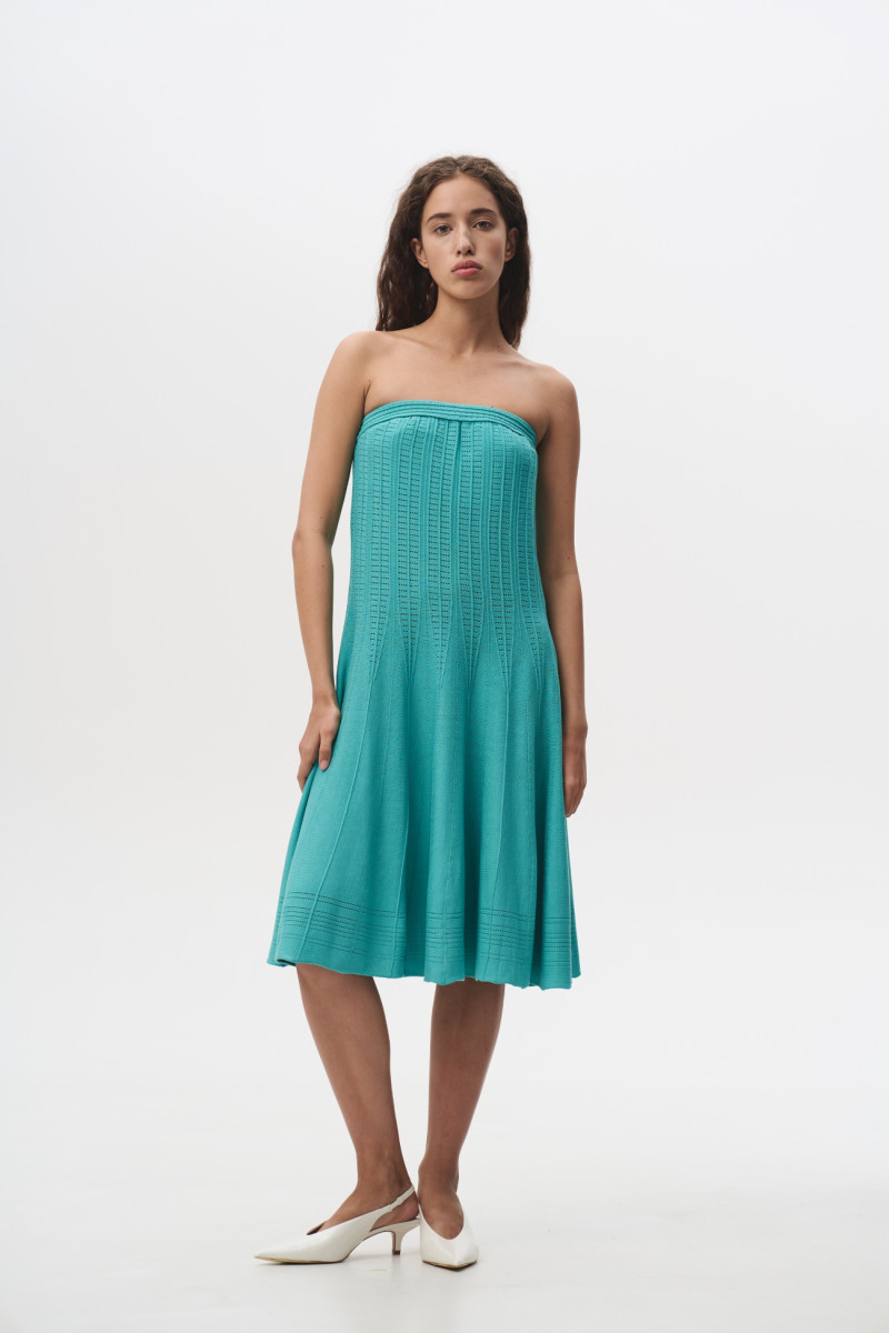 Трикотажна сукня-бандо А-подібного силуету, довжиною за коліна з віскозної пряжі з мережевним переплетення по ліфу. Верх оздоблений планкою в тонку об’ємну смужку, з якої відходять вив’язані, тонкі, об’ємні, вертикальні промені, що перетинаються з горизонтальними мереживними лініями по низу сукні.