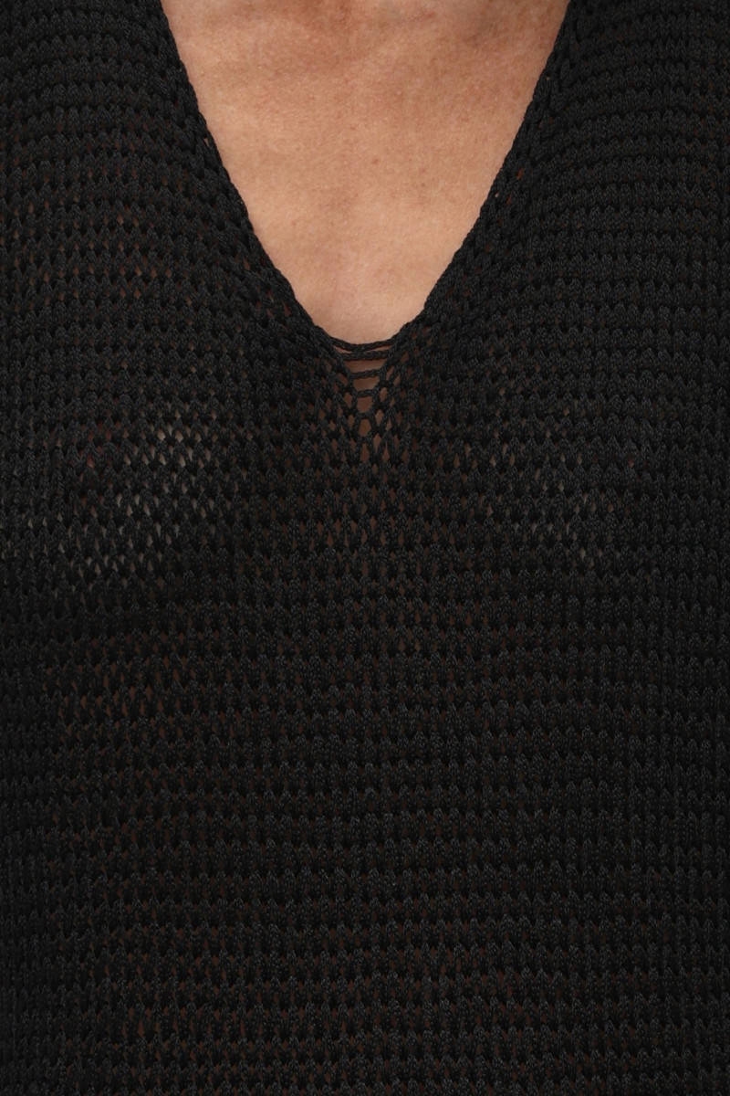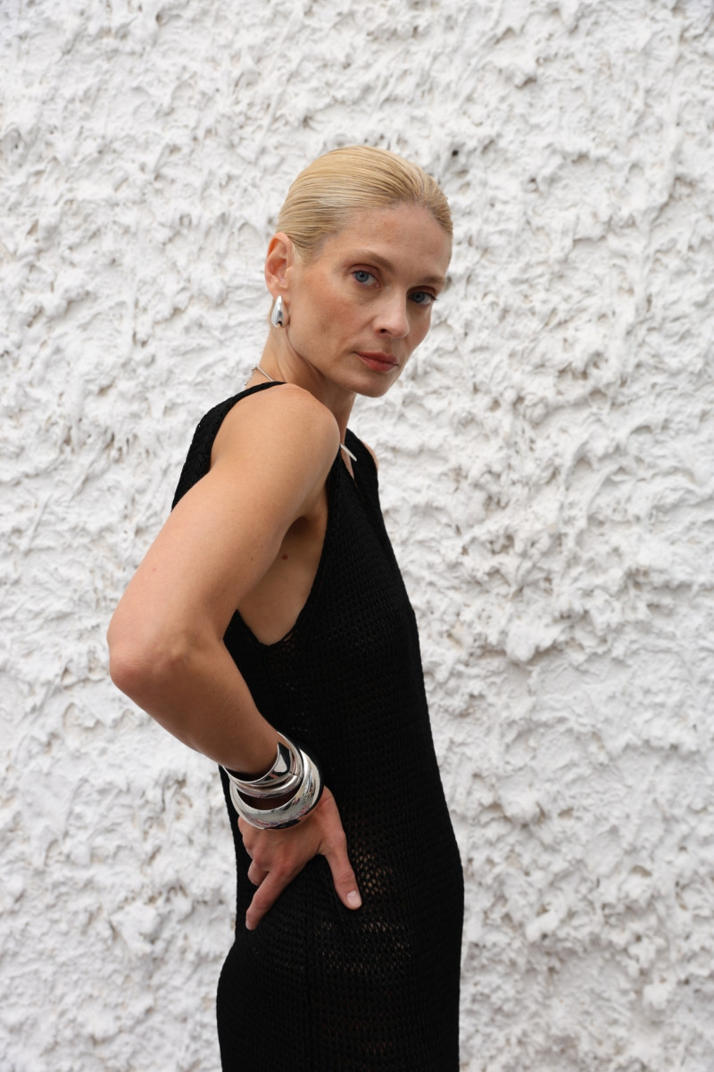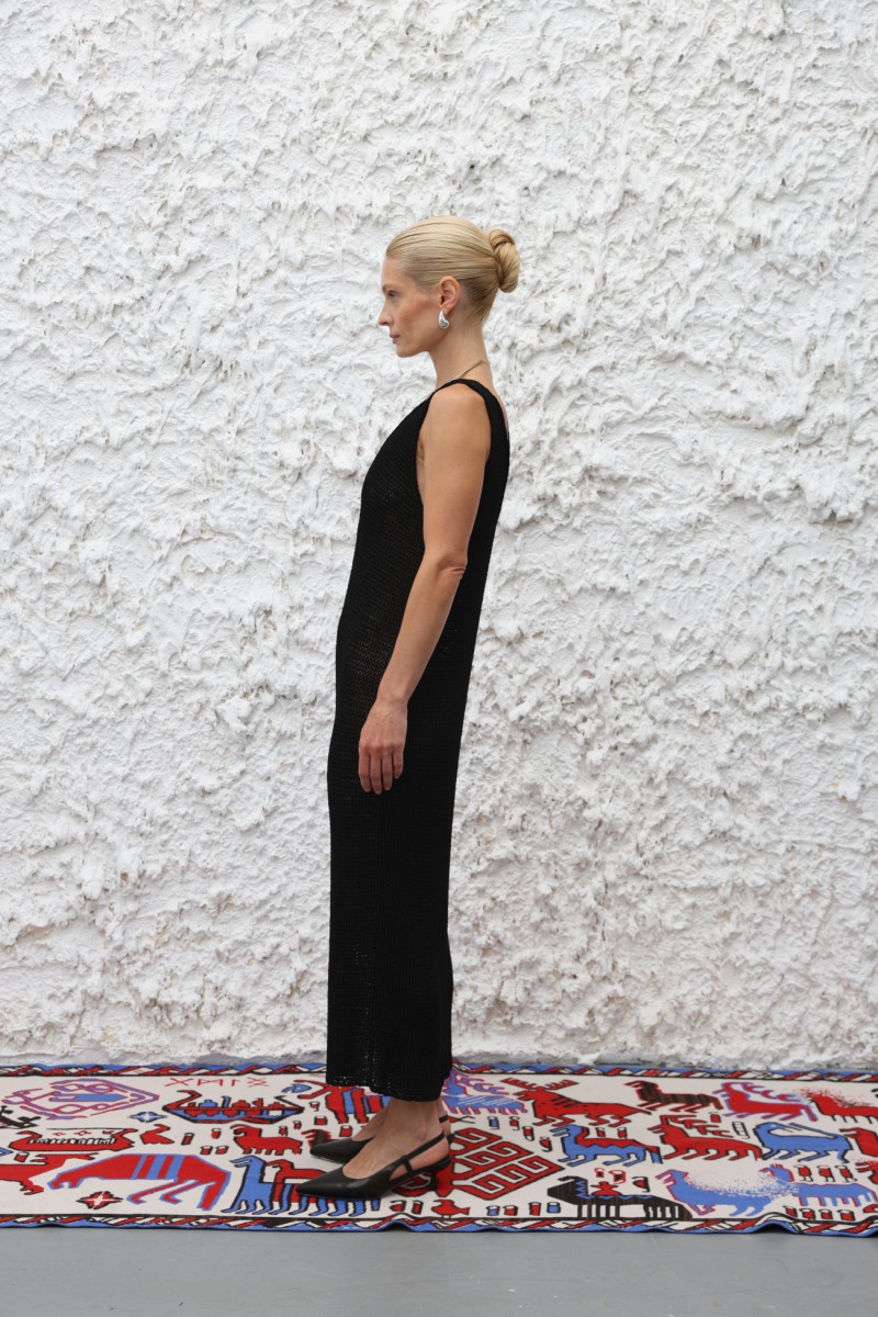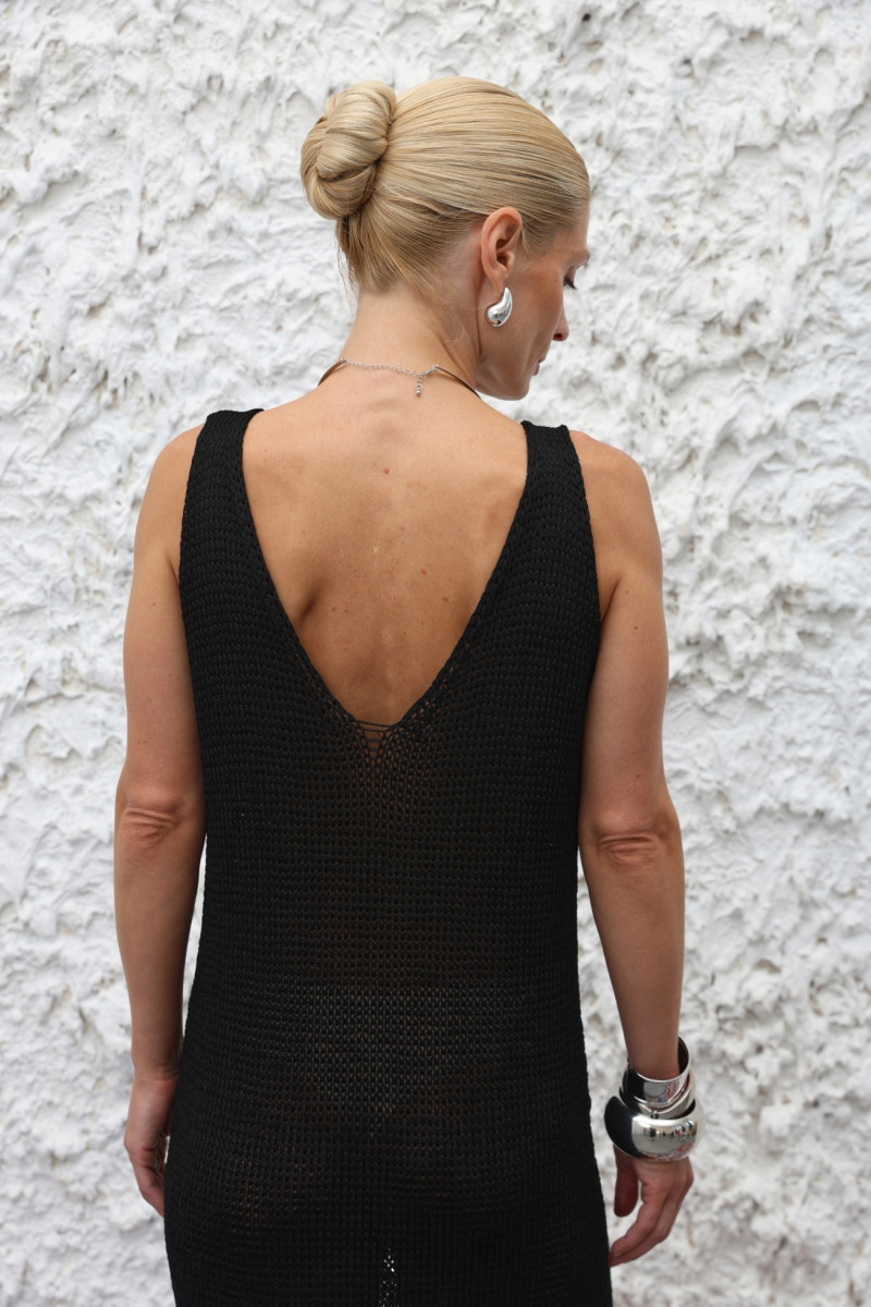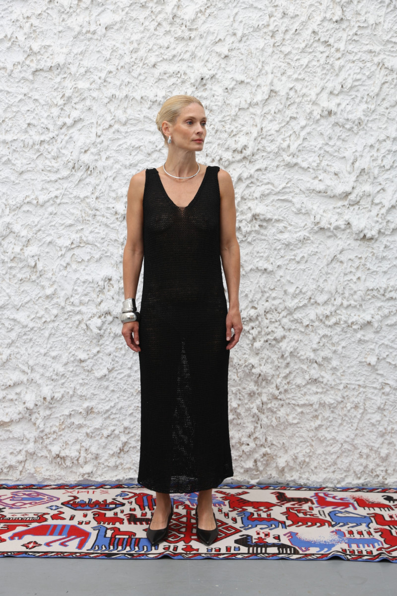 Сукня з шовковистої віскозної пряжі з об’ємним повітряним переплетенням «лицева гладь», що створює ніжну однорідну текстуру. Прямий силует, довжина до середини гомілки, глибокий V-подібний виріз спереду та на спинці.
