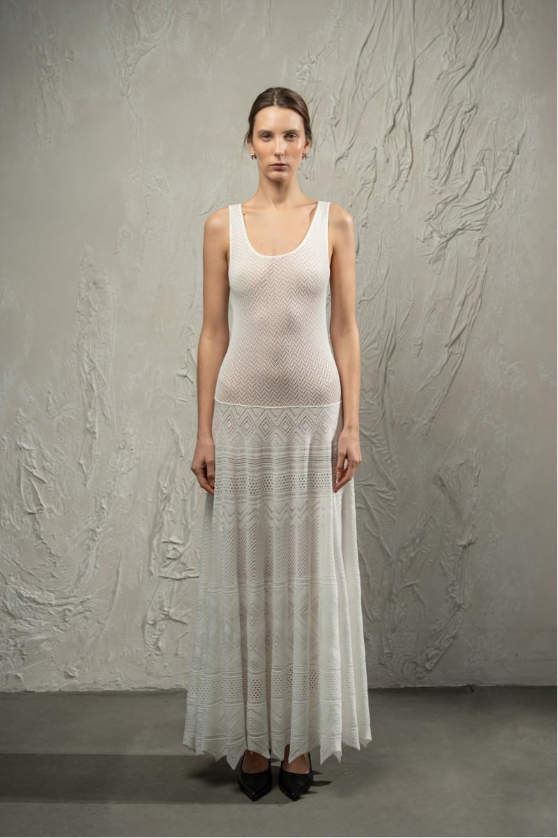 Трикотажна мереживна максісукня з віскозної пряжі у переплетінні, що поєднує різні геометричні орнаменти, формуючи виразну мереживну фактуру та ритмічний візерунок по всій довжині.