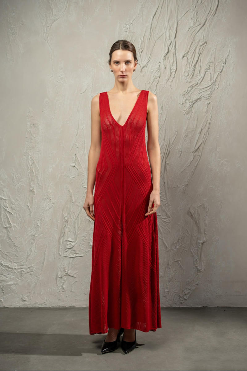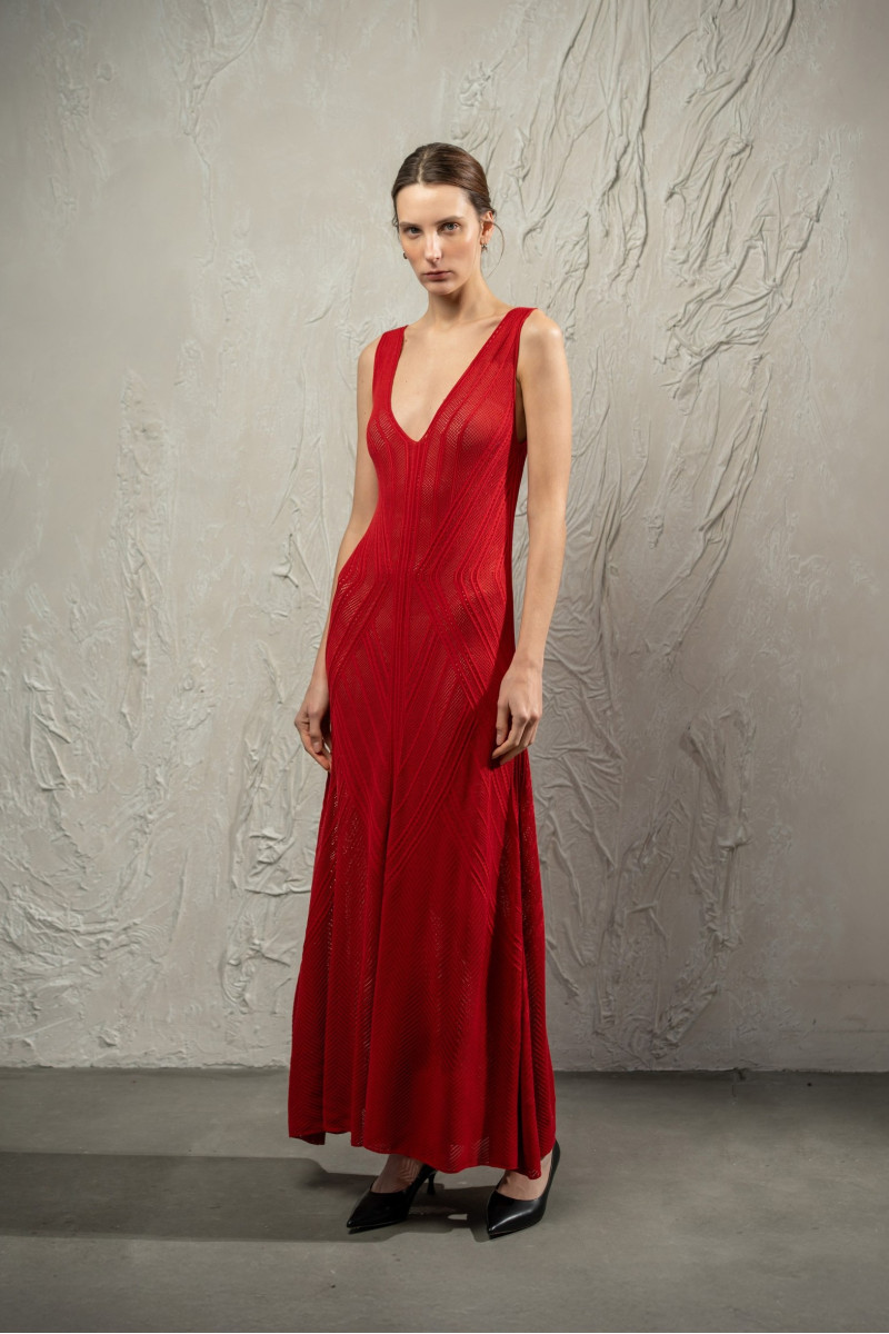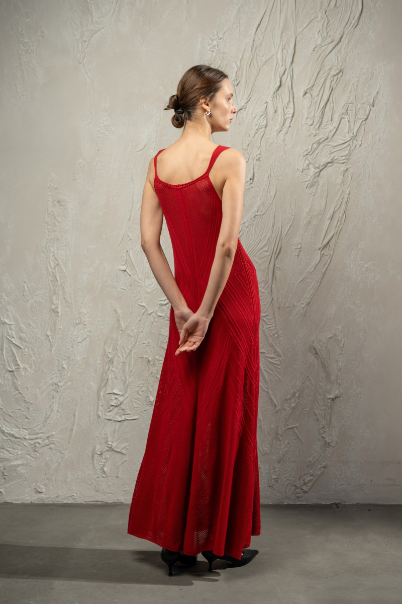 Трикотажна мереживна максісукня з віскозної пряжі на бретелях середньої ширини. Модель А-подібного силуету: облягаючий ліф плавно розширюється від талії. Виконана з мереживного переплетіння з вертикальними ритмічними лініями та діагональними акцентами. V-подібний виріз горловини та бретелі підкреслюють легкість і жіночність силуету.