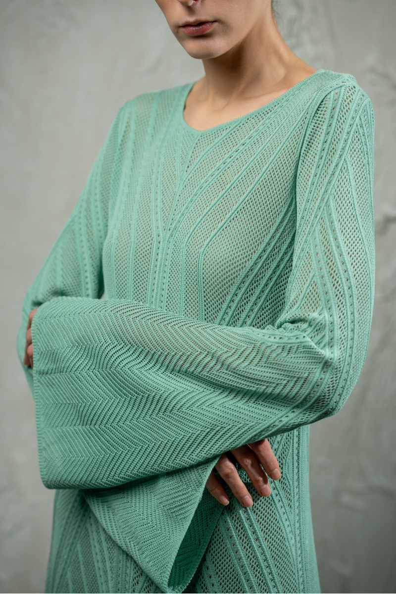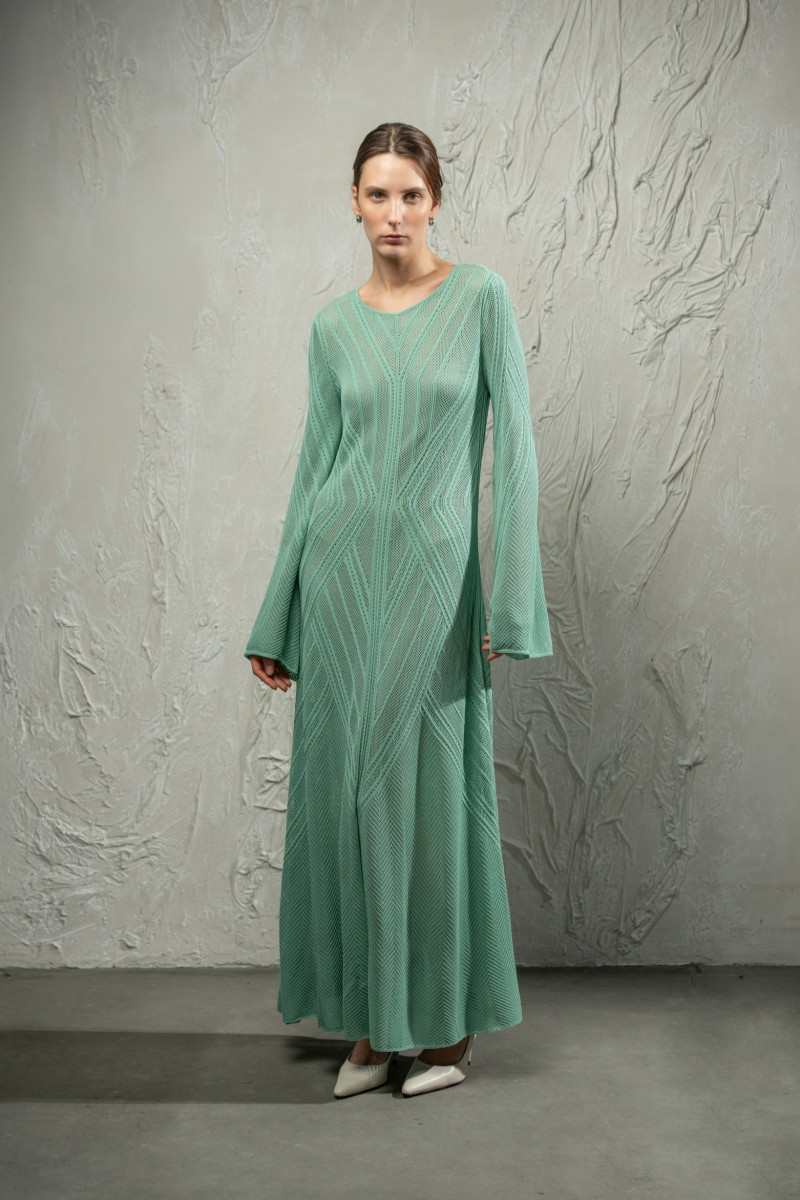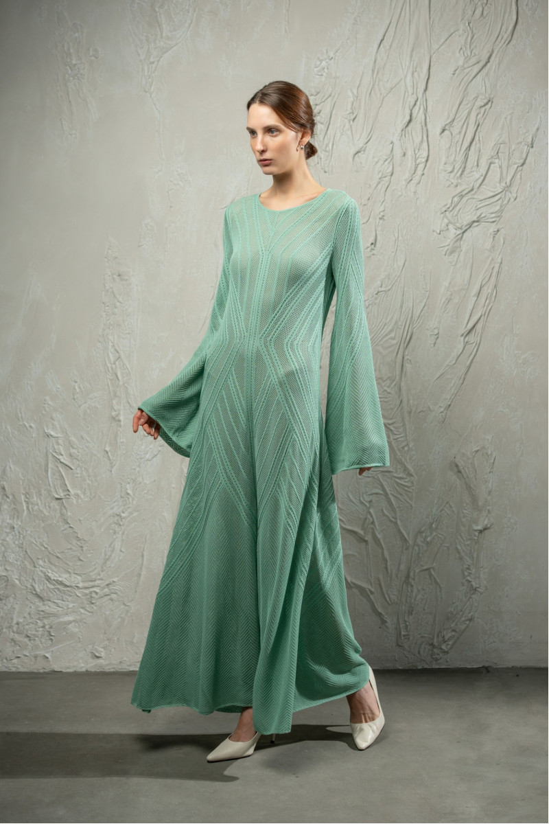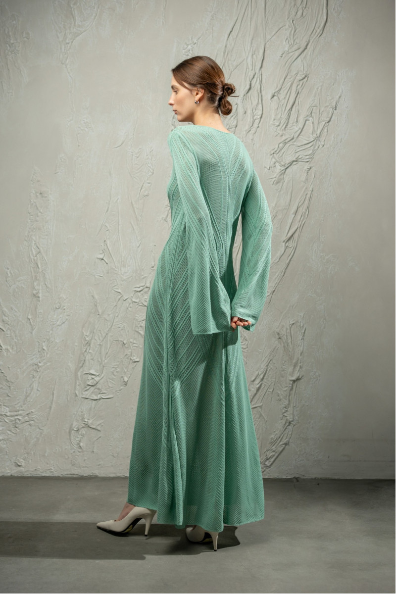 Трикотажна мереживна максісукня з довгим рукавом з віскозної пряжі. Цільнов’язана модель А-подібного силуету виконана з мереживного переплетіння з вертикальними ритмічними лініями та діагональними акцентами на талії. Довгі рукави розширені донизу, горловина округла. Краї горловини, рукавів та низу оформлені щільним переплетінням для стабільної форми.