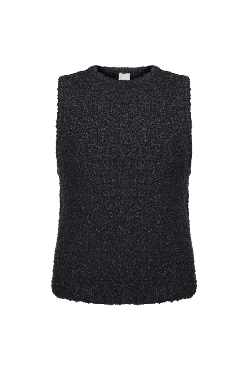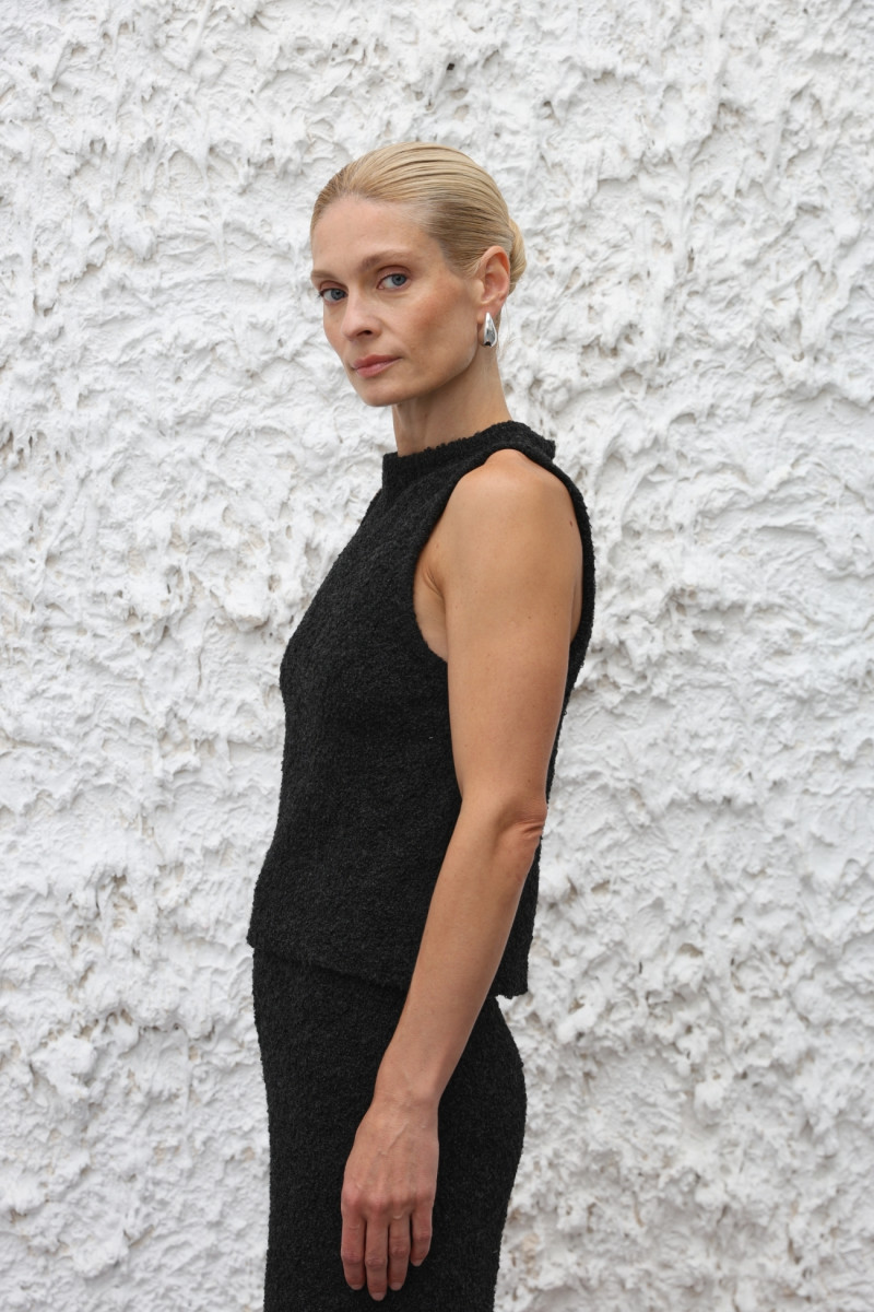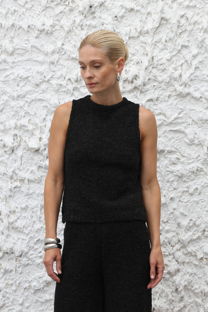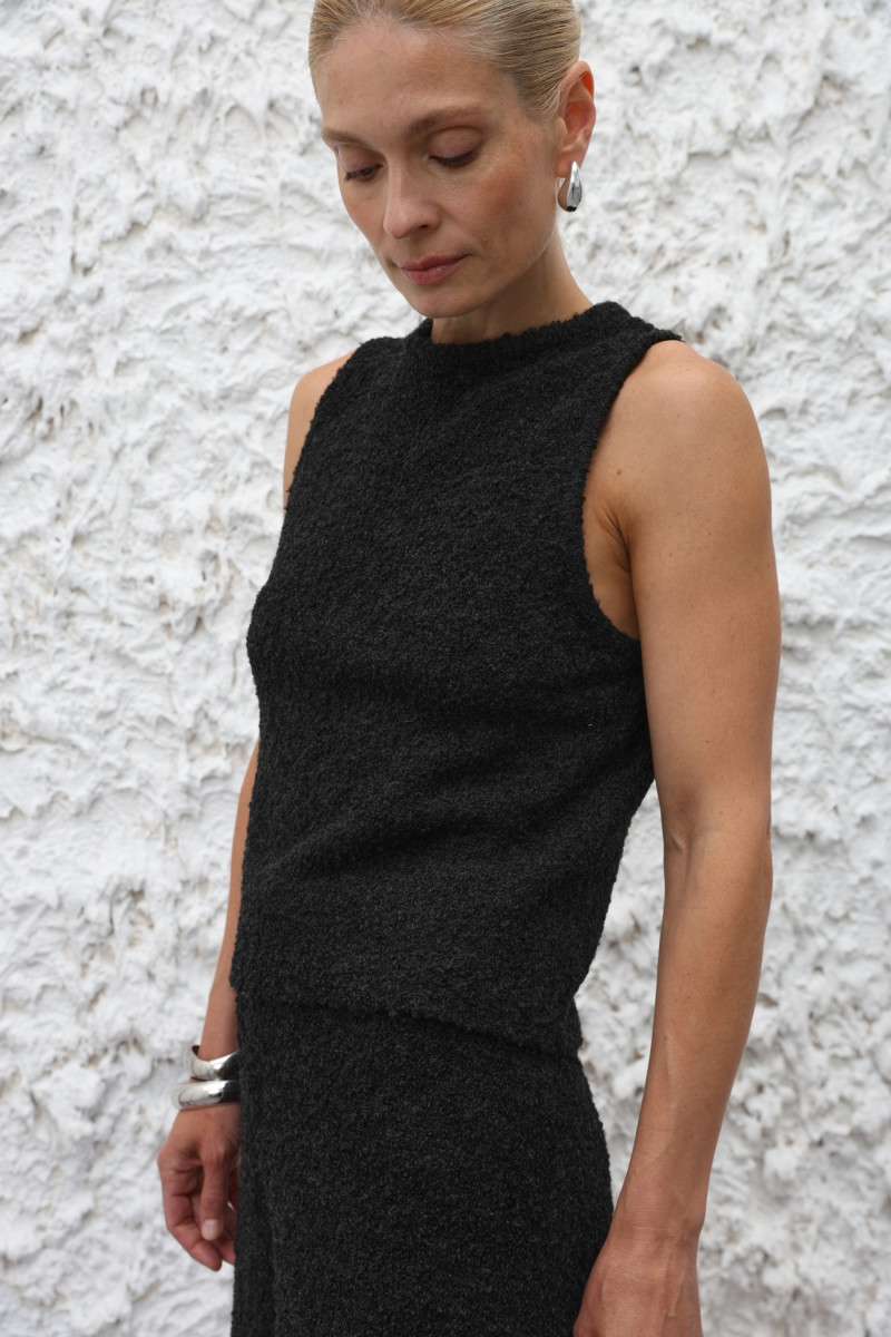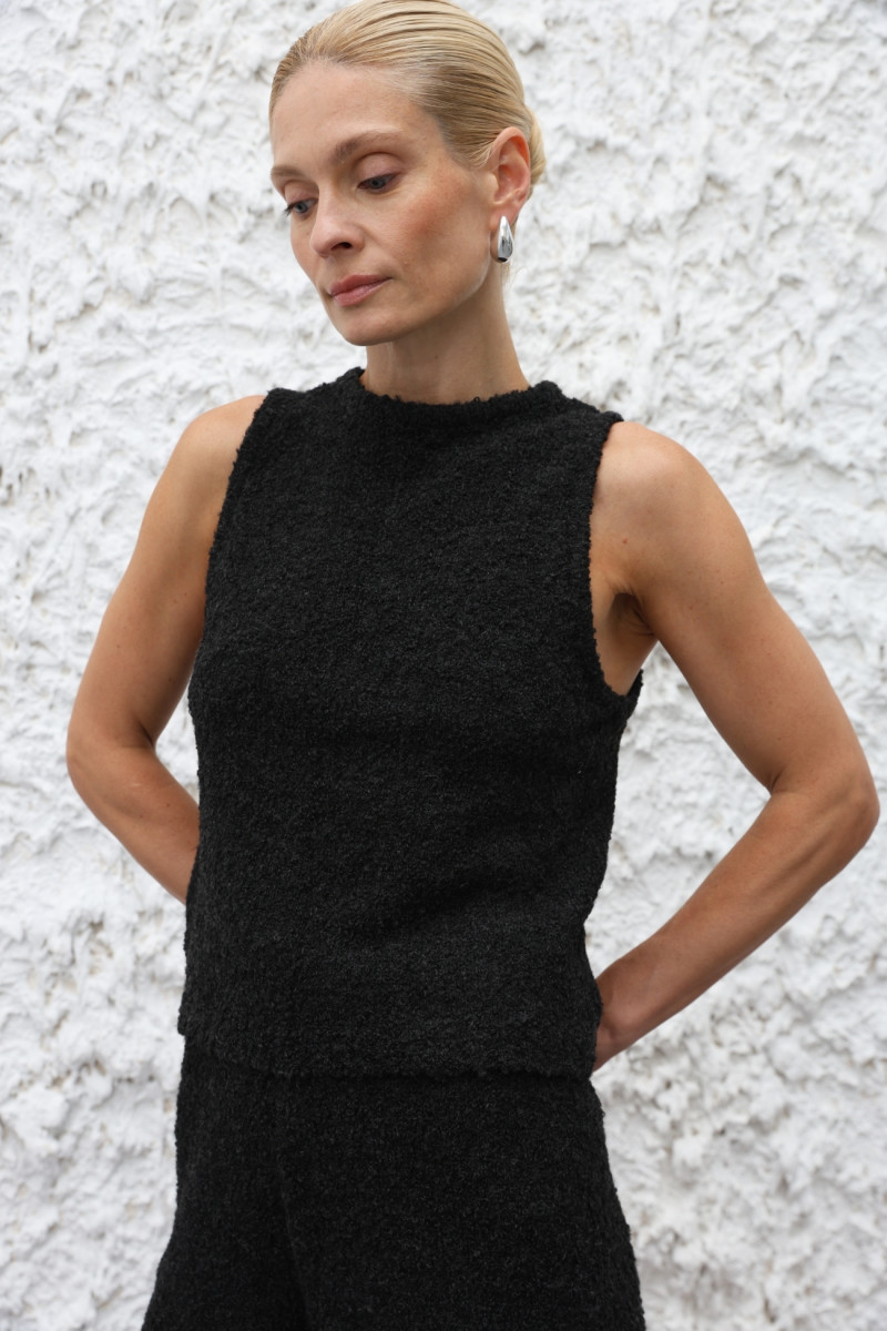 Трикотажний топ із м’якої вовняної пряжі з переплетенням, що імітує руно. Прямий облягаючий силует, довжина нижче талії, кругла горловина, широкі бретелі.