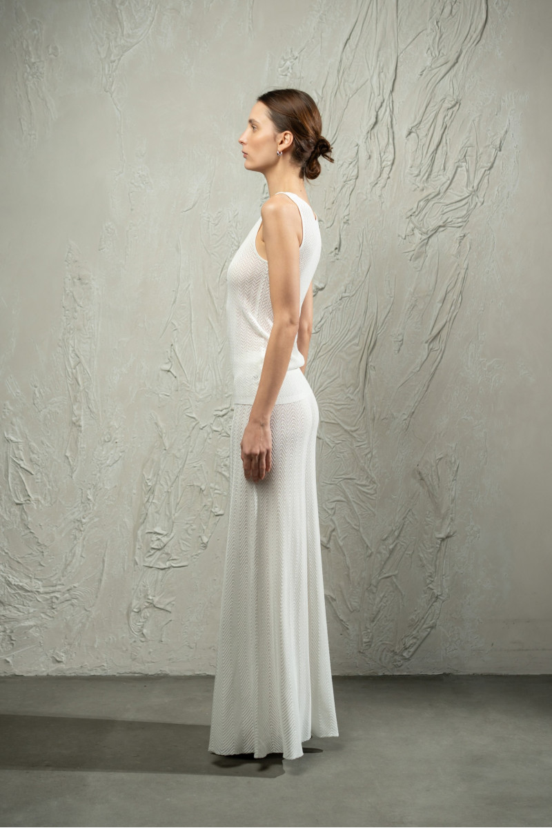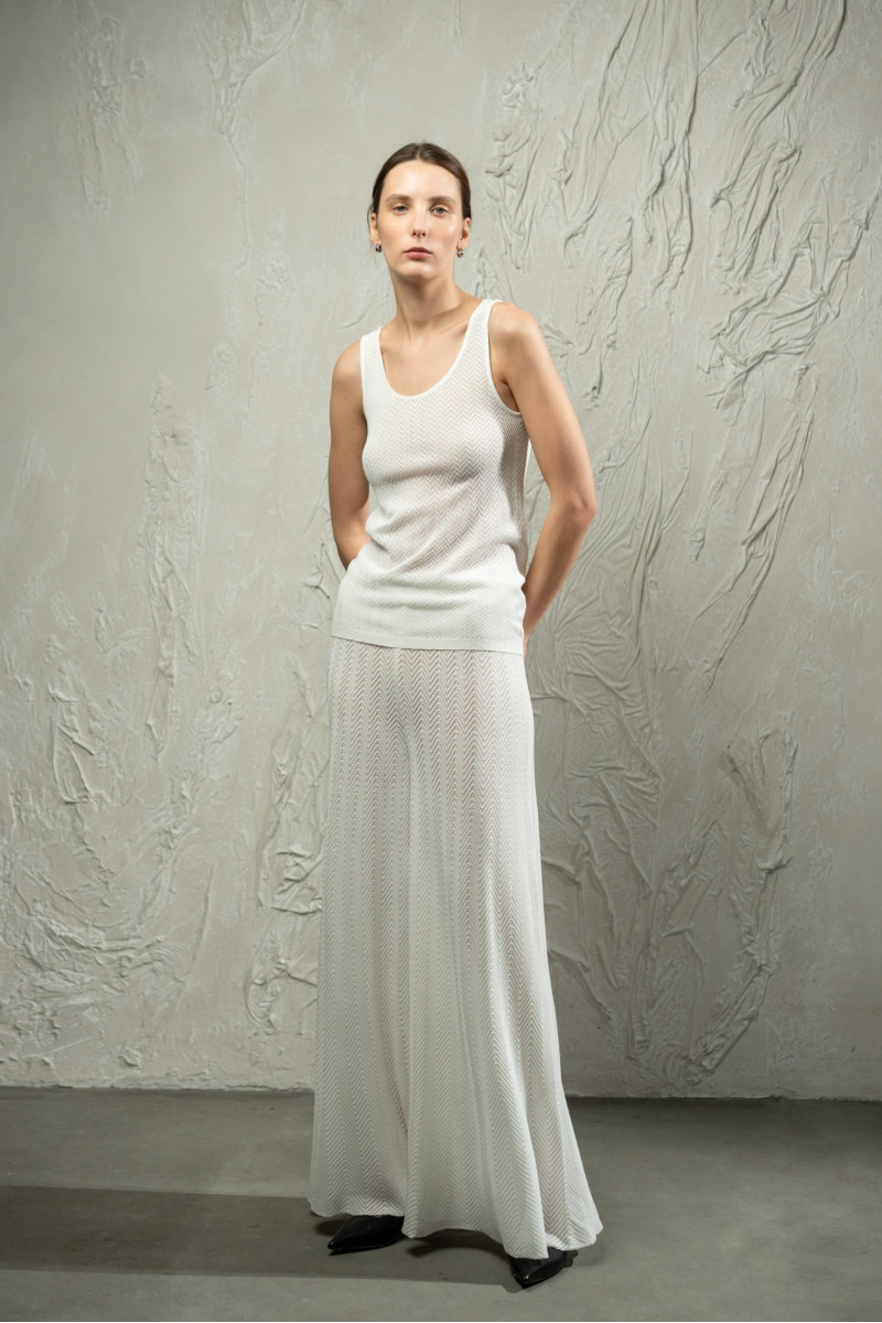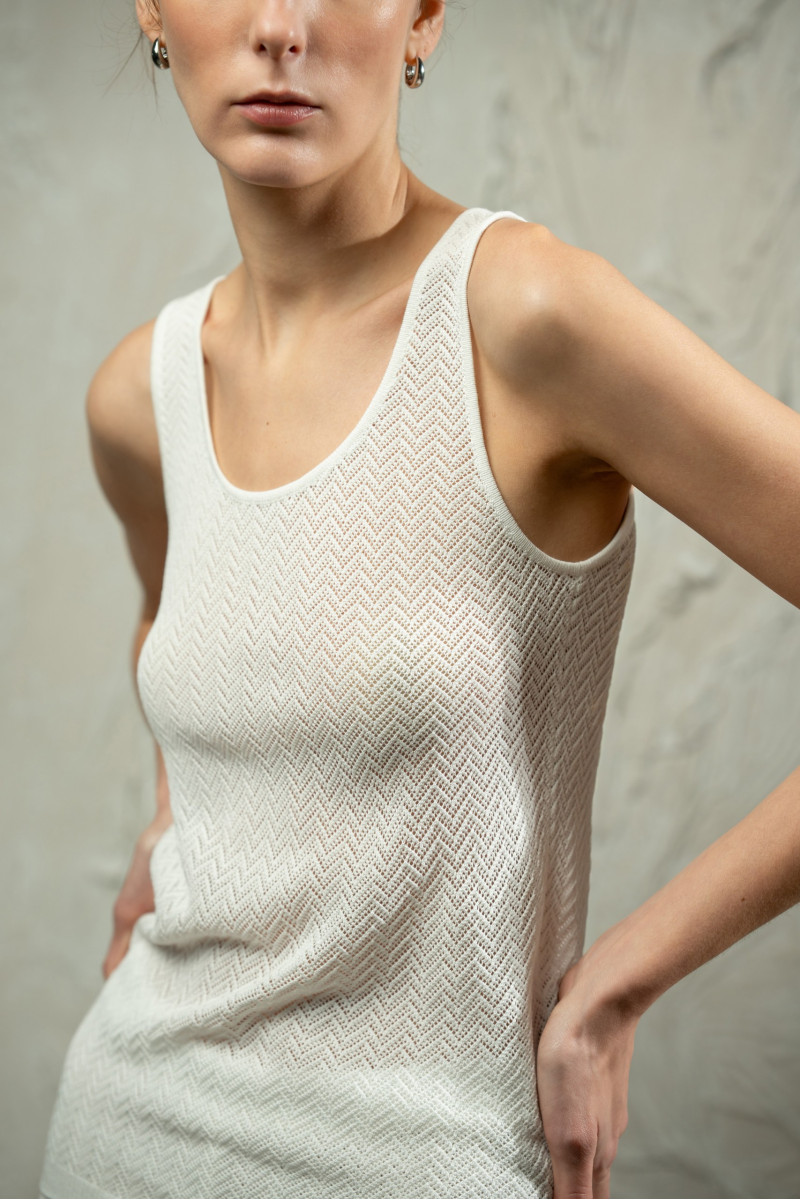 Трикотажний топ з мереживним переплетінням ялинка на бретелях середньої ширини. Модель прямого силуету з круглою горловиною, довжиною до середини стегна. Горловина та низ виробу оформлені щільним гладким переплетінням.