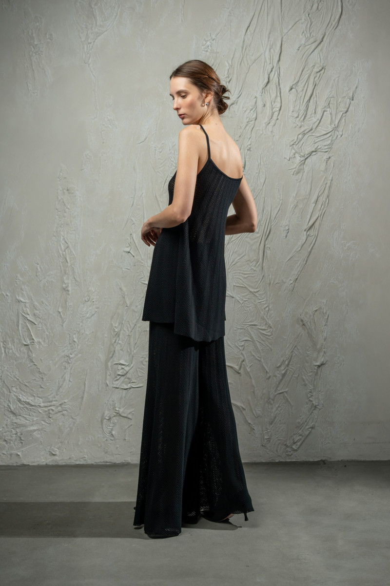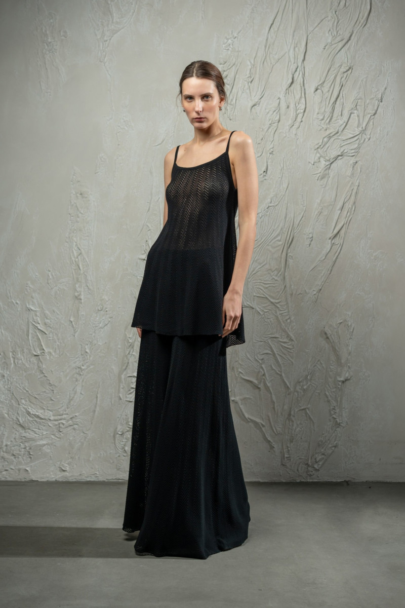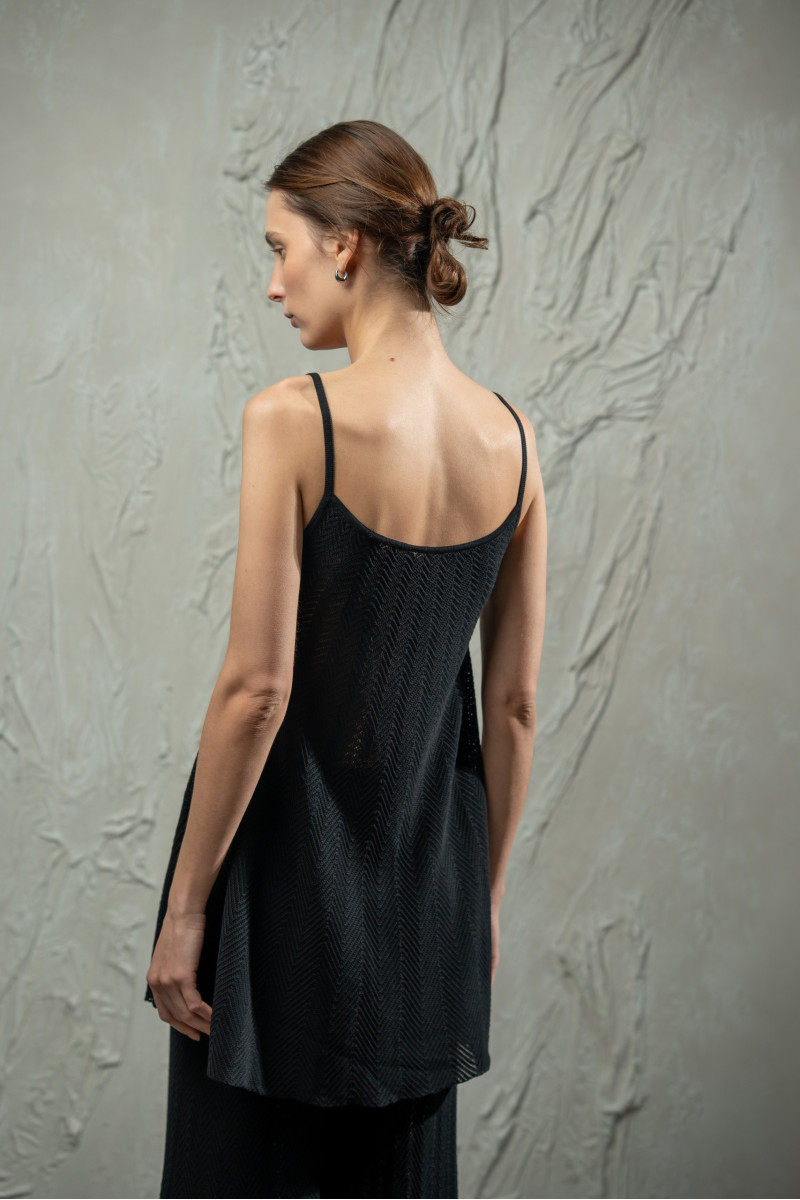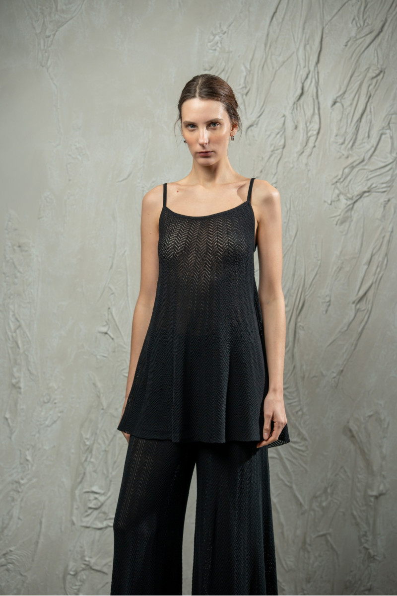 Трикотажний топ з мереживним переплетінням ялинка з клиноподібним розширенням до низу. Модель А-подібного силуету, вільна від грудей, з прямою округлою горловиною та тонкими бретелями. Високі бокові розрізи додають легкості силуету. Горловина та низ виробу оформлені щільним гладким переплетінням.