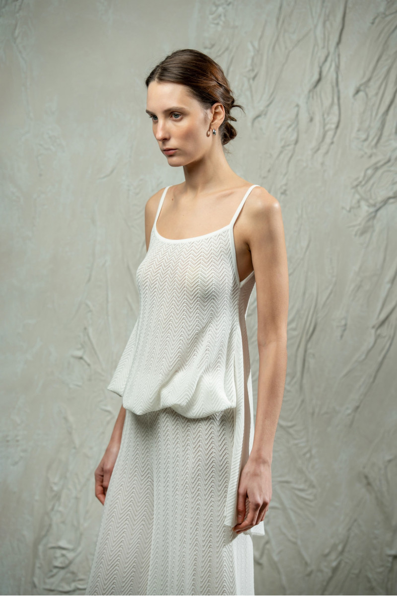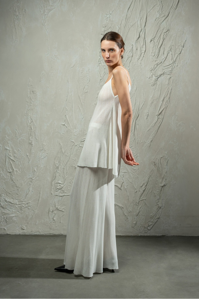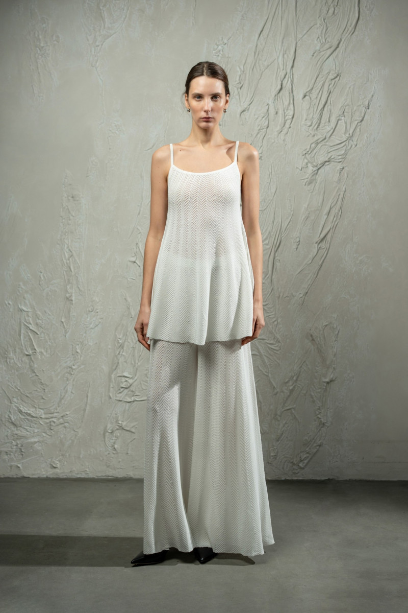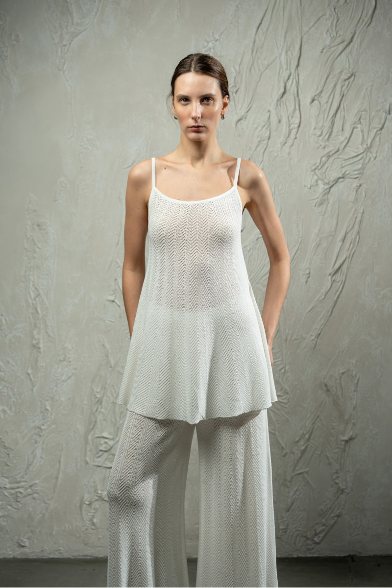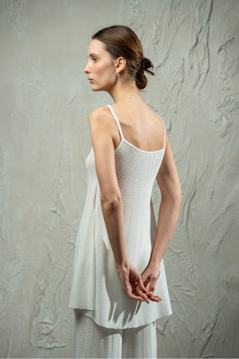 Трикотажний топ з мереживним переплетінням ялинка з клиноподібним розширенням до низу. Модель А-подібного силуету, вільна від грудей, з прямою округлою горловиною та тонкими бретелями. Високі бокові розрізи додають легкості силуету. Горловина та низ виробу оформлені щільним гладким переплетінням.