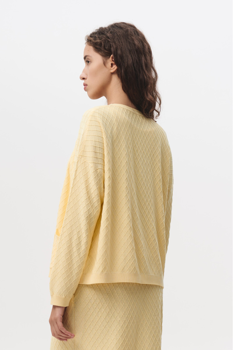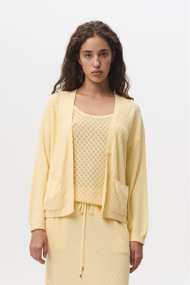 жакет на ґудзиках з віскозної пряжі з переплетінням у вигляді дрібних ромбів. V-подібний
