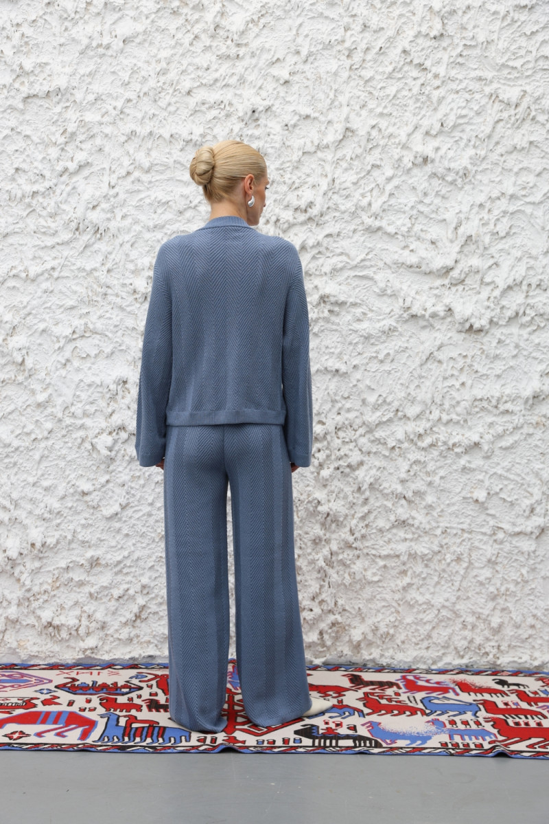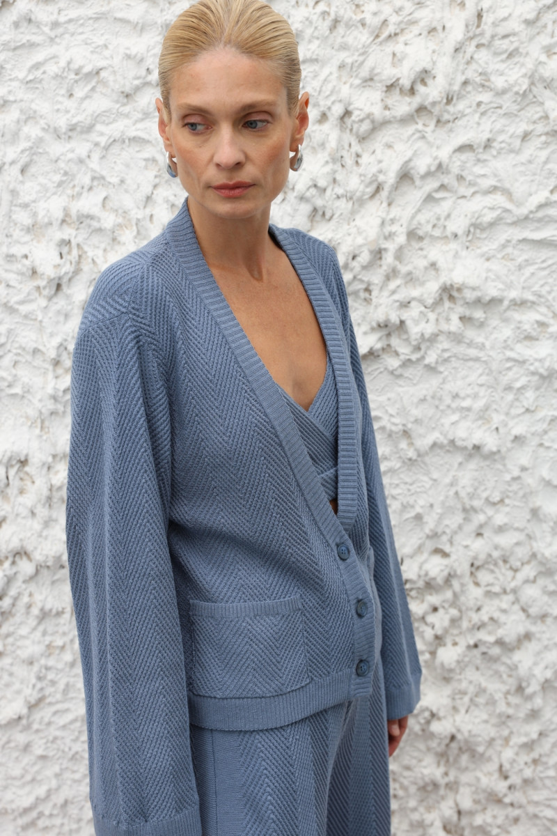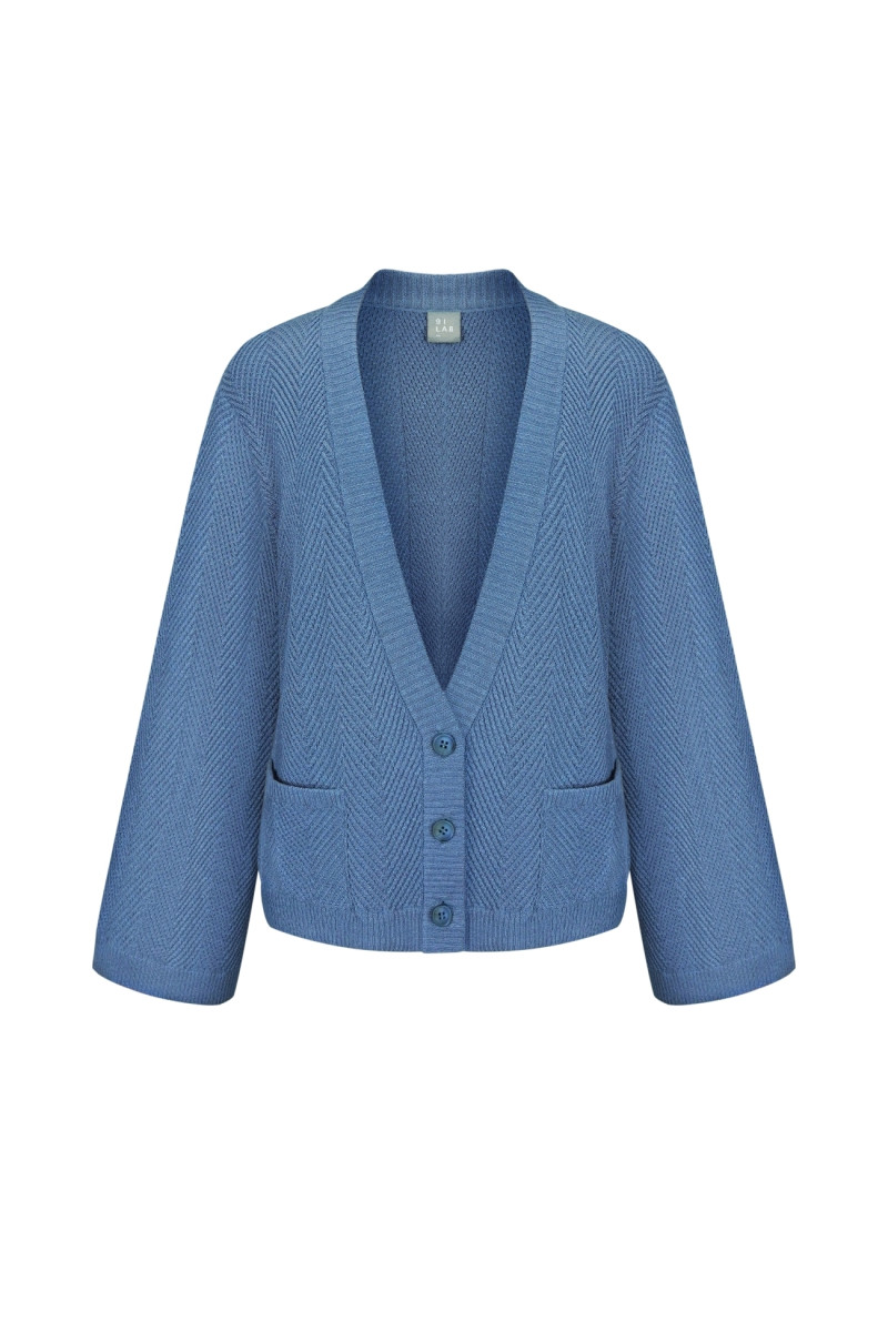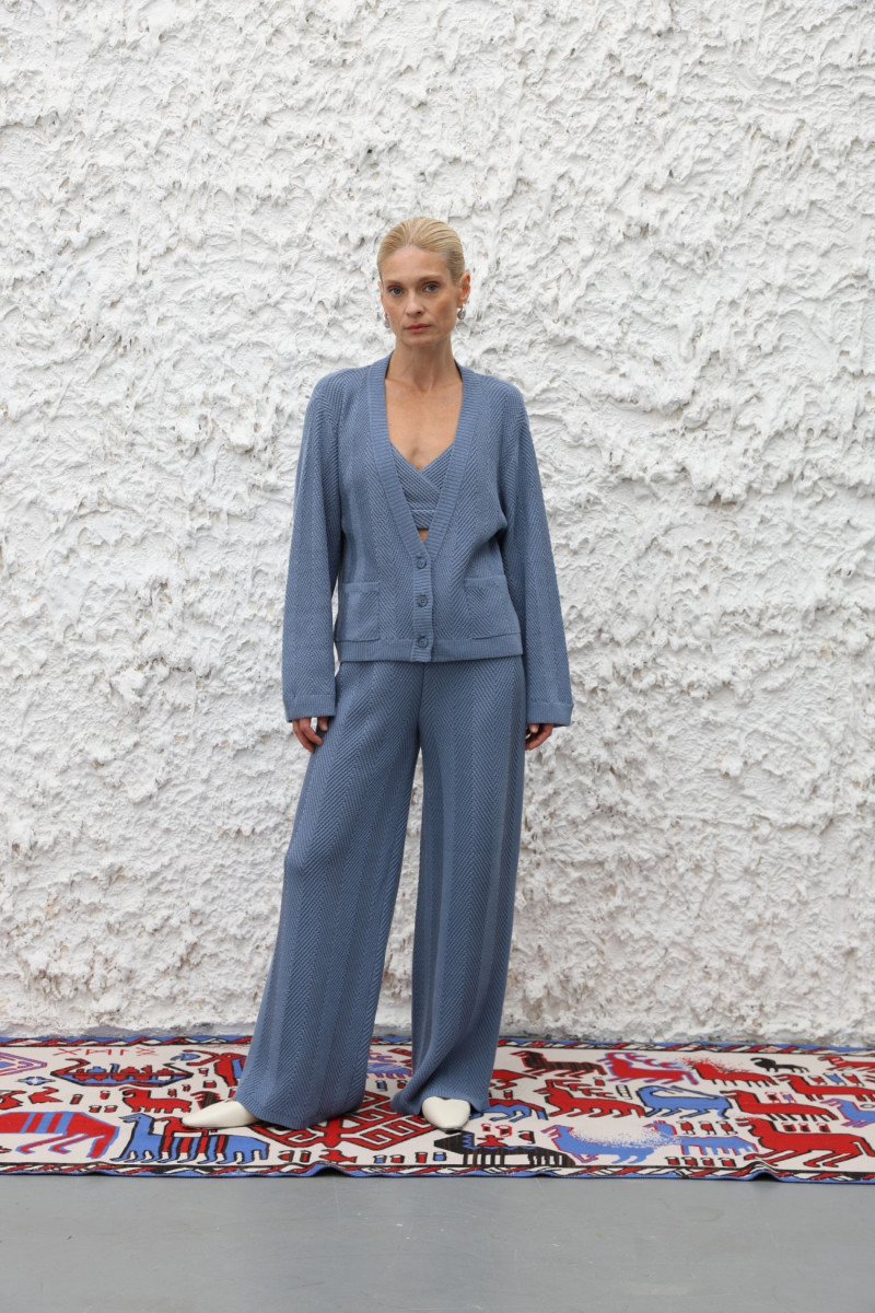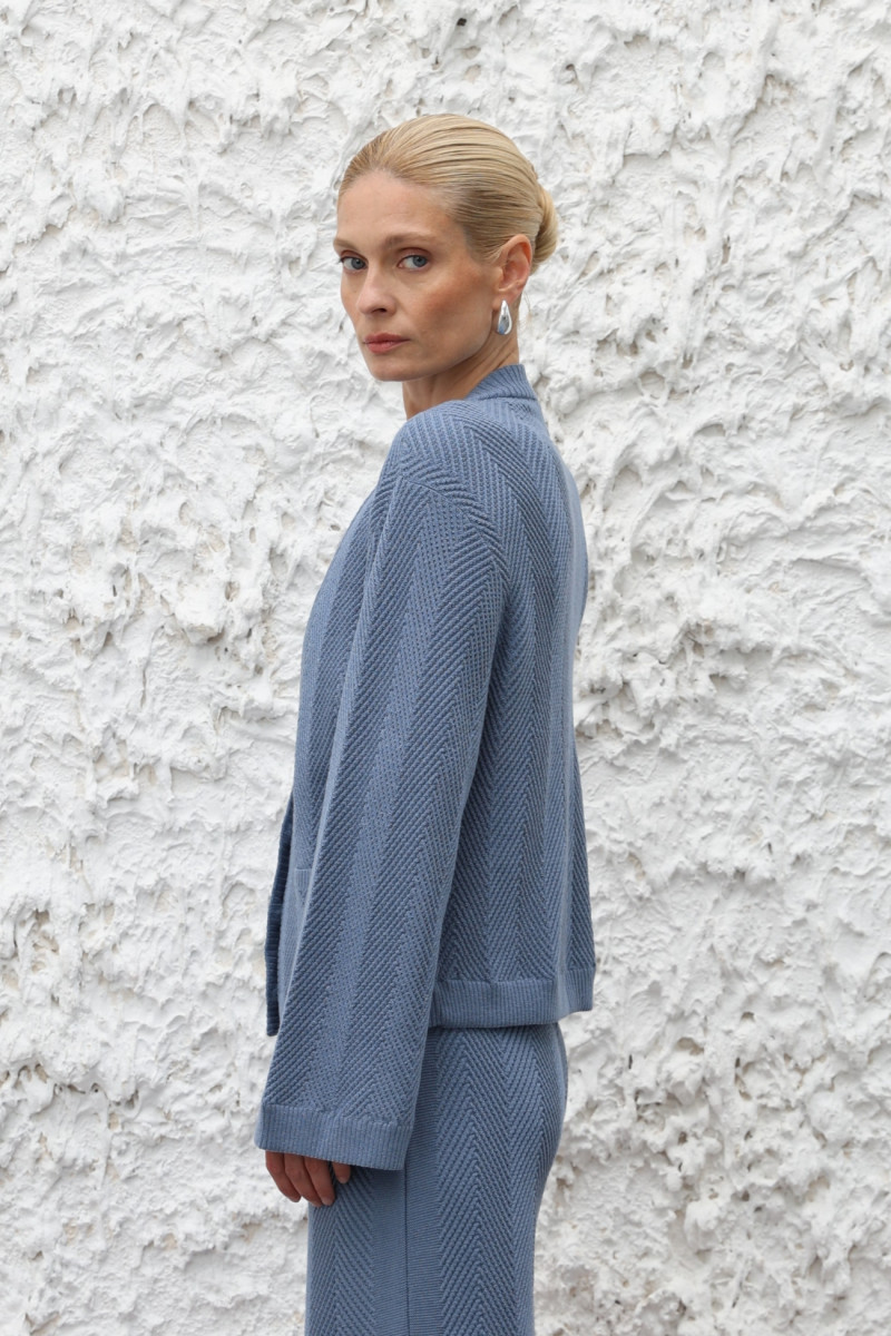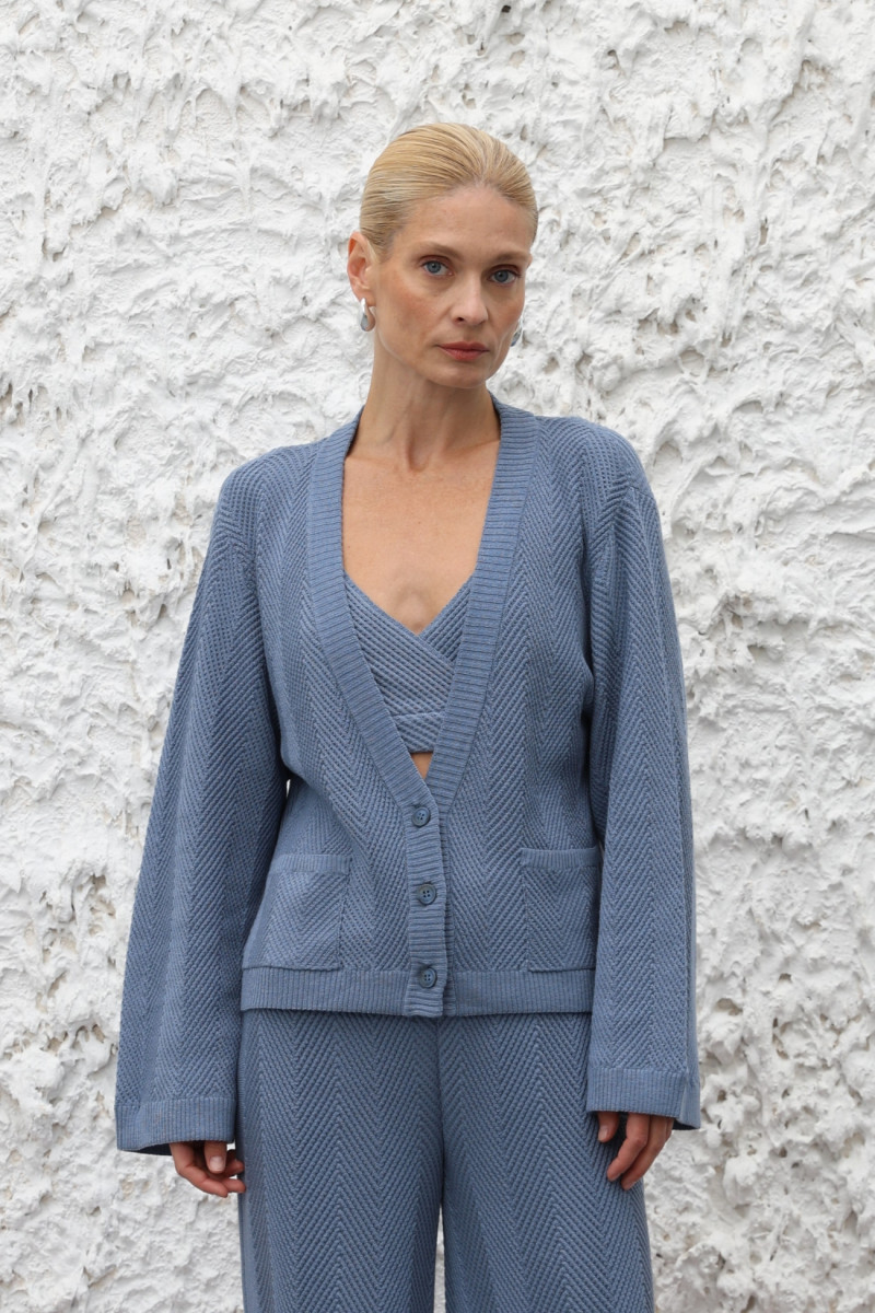 Трикотажний жакет із тонкої вовняної пряжі щільного переплетення «ялинка», що створює вертикальний візерунок і візуально подовжує силует. Прямий напівоблягаючий силует середньої довжини, глибока V-подібна горловина, довгі рукави, застібка на ґудзики та накладні кишені спереду. Горловина, планка, манжети й низ виконані у переплетінні «резинка».