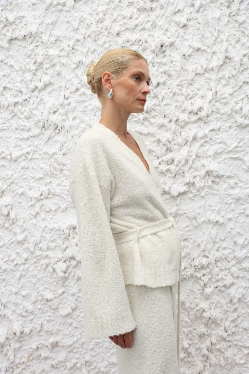 Трикотажний жакет із м’якої вовняної пряжі з переплетенням, що імітує руно. Прямий силует, середня довжина, V-подібна горловина, приспущене плече, довгий втачний рукав без манжета. Фіксується на запах за допомогою пояса. Горловина, планка, пояс та низ — у переплетенні «резинка».