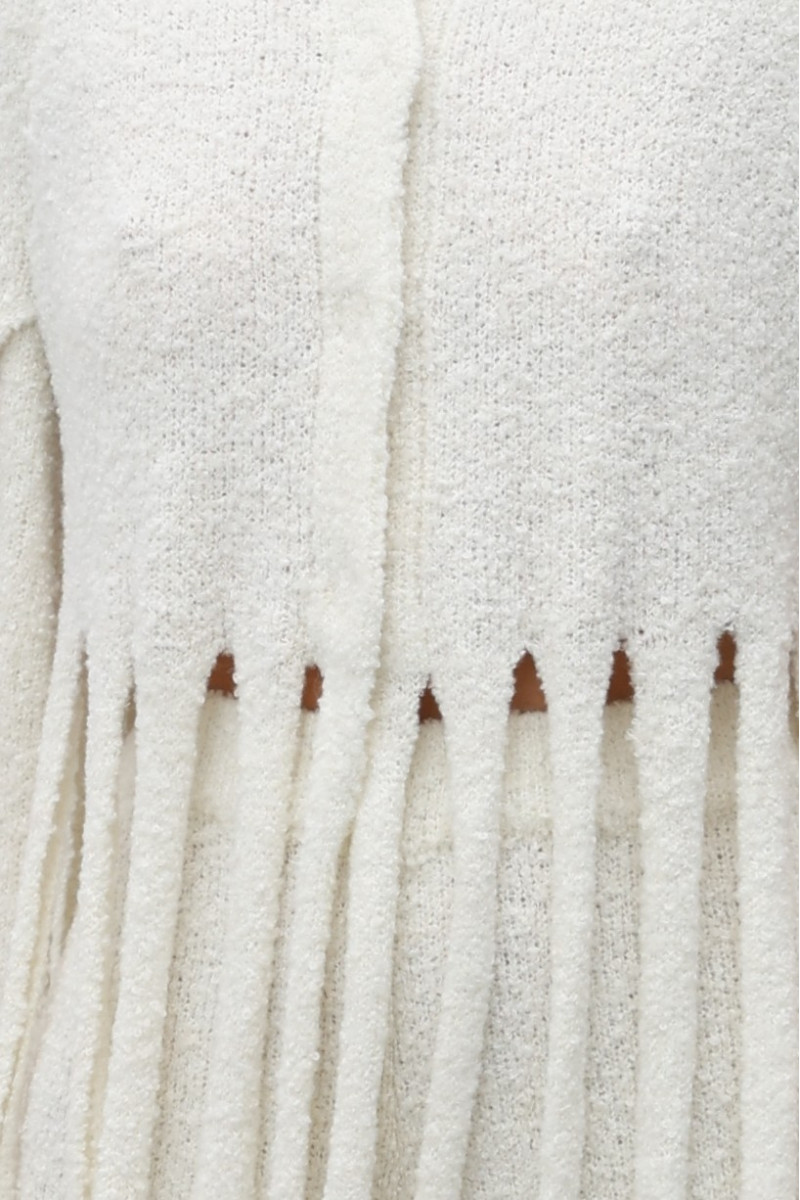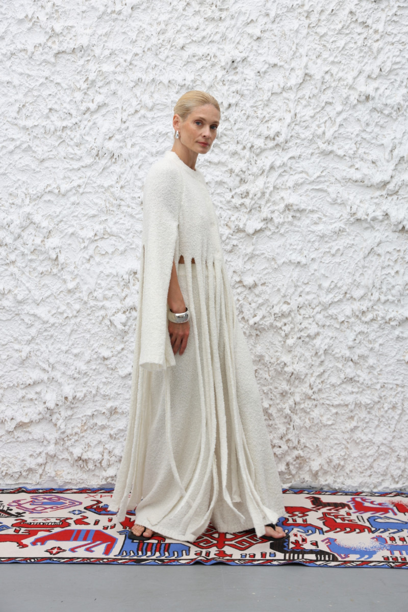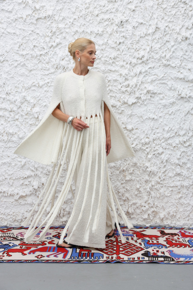 Трикотажний жакет з м’якої вовняної пряжі з переплетенням, що імітує руно. Прямий силует, кругла горловина, застібка на прихованих кнопках. Рукави-накидки з глибокими розрізами від пахв до зап’ясть та китиці від талії до щиколоток — відсилання до одягу пізнього Середньовіччя слов’ян та вікінгів.