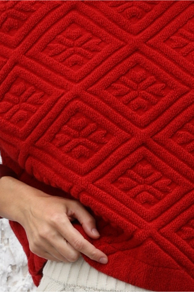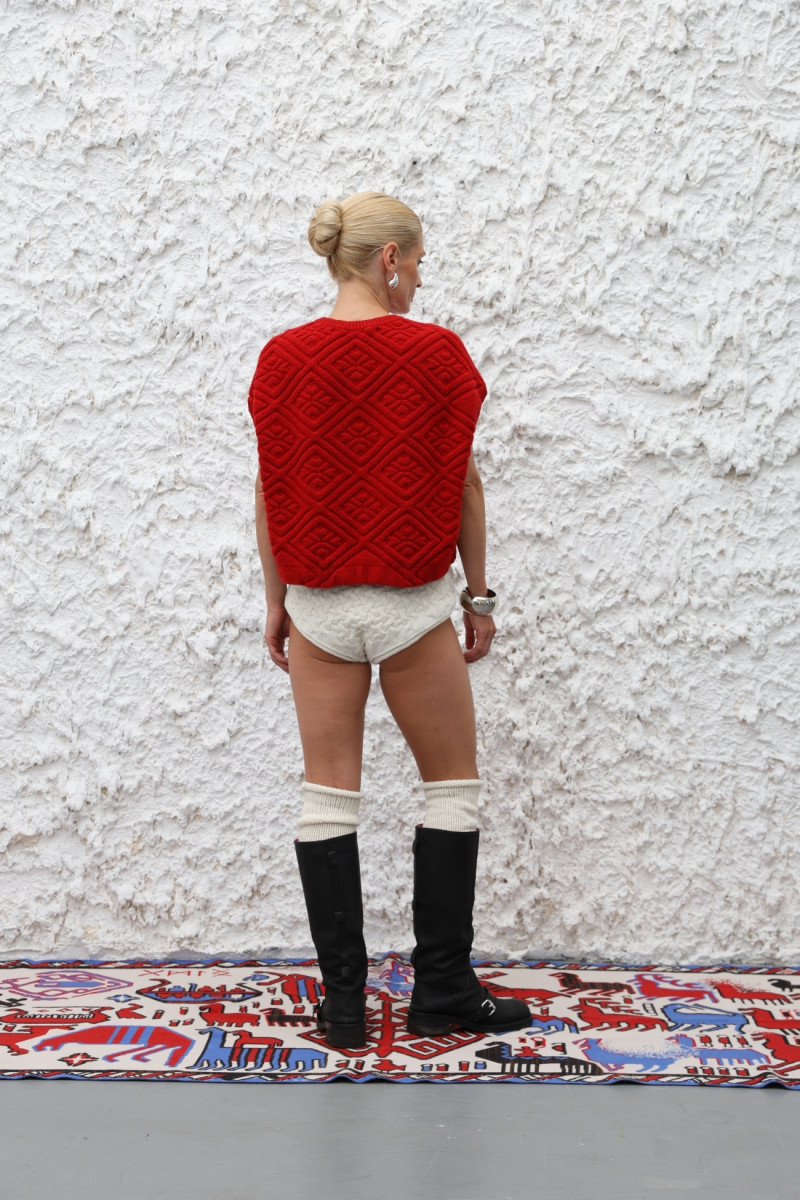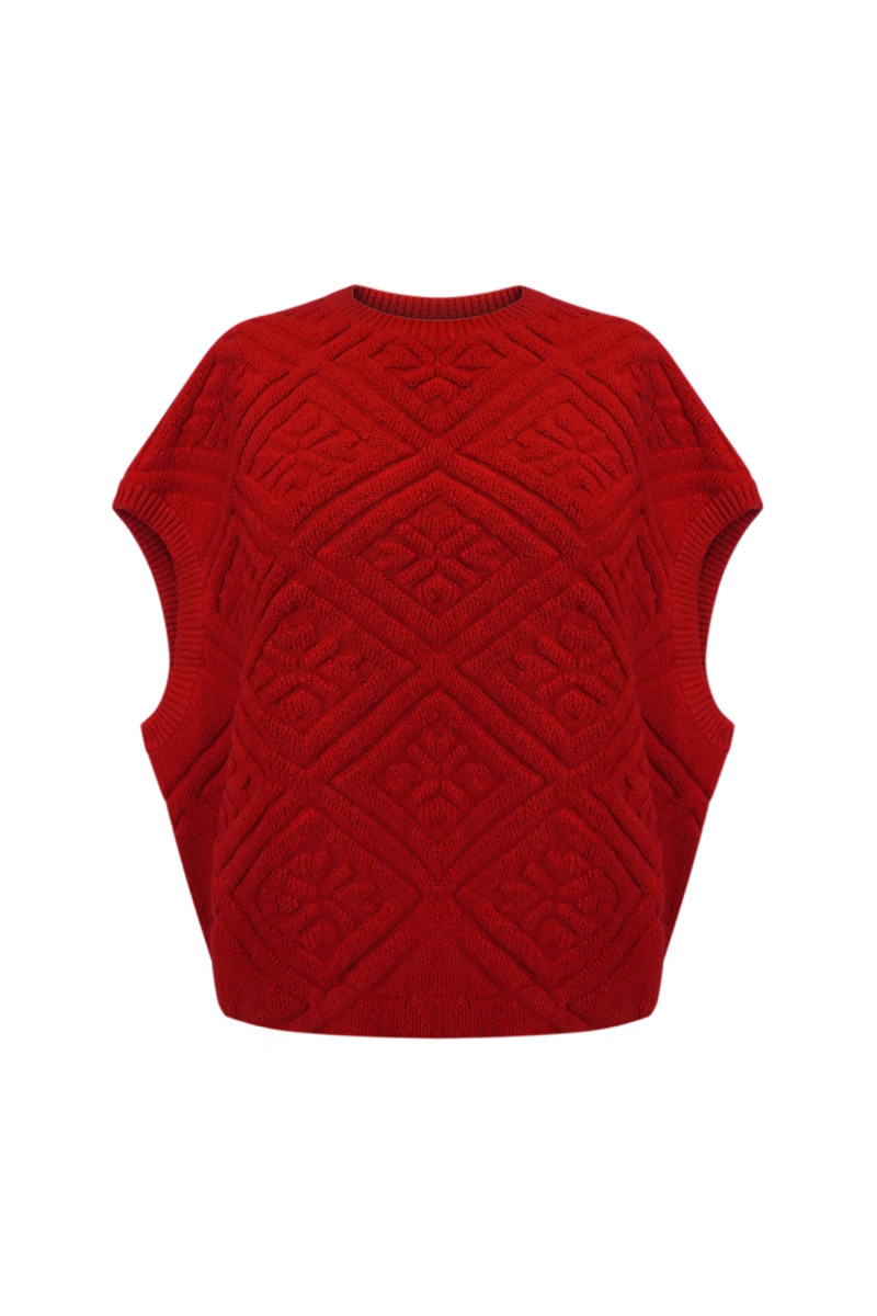 Об’ємний oversize-жилет з переплетенням, що імітує вистрижене аранами руно. Довжина — нижче лінії талії. Кругла горловина, спущене плече. Горловина, пройми та низ виконані в переплетенні «гумка».
