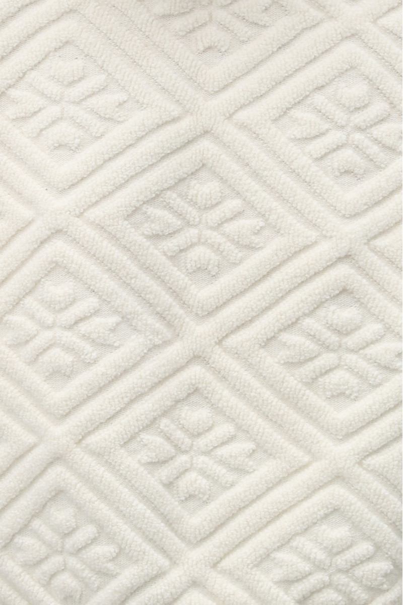 Об’ємний oversize-жилет з переплетенням, що імітує вистрижене аранами руно. Довжина — нижче лінії талії. Кругла горловина, спущене плече. Горловина, пройми та низ виконані в переплетенні «гумка».